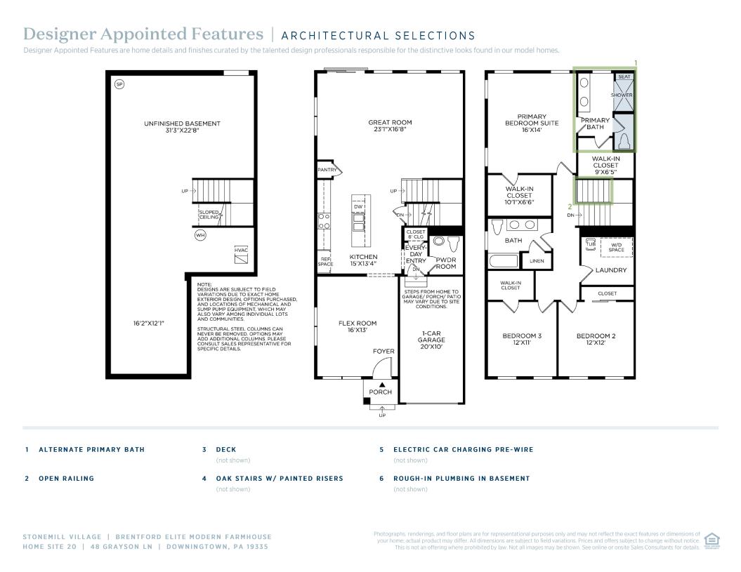 The Brentford Elite offers a comfortable and flexible layout designed for modern living. A welcoming foyer opens to a versatile flex room, ideal for a home office, formal dining, or creative space. The spacious great room connects seamlessly to the kitchen, which features a center island and pantry. A nearby powder room adds convenience for guests, while the everyday entry off the one-car garage includes a closet for effortless organization. Upstairs, the private primary suite features two walk-in closets and a spa-inspired bath with a dual-sink vanity and a spacious shower. Two secondary bedrooms share a full hall bath, and the laundry room is thoughtfully positioned nearby for easy access.
