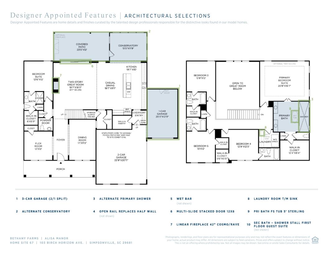 The stunning Alisa offers comfort and style for all for you. Enter through a welcoming foyer that flows past a formal dining room and flex room, leading into the two-story great room, perfect for entertaining guests or relaxing with family. Enjoy cooking in the well-appointed kitchen featuring a spacious island, walk-in pantry, and a casual dining area. The second floor features the palatial primary bedroom suite with dual vanities in the primary bath, a luxurious shower, private toilet closet and a generous walk-in closet. Also upstairs are secondary bedrooms each complete with their own private bathrooms and sizable closets. An additional bedroom suite is secluded off the great room featuring a private bathroom and walk-in closet. Additional highlights included easily accessible second-floor laundry, a powder room, and ample storage space.