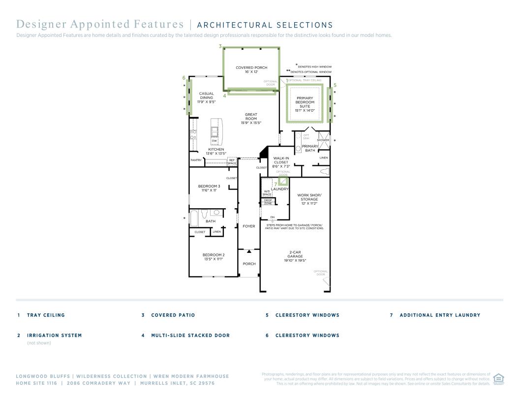Deluxe features and ample room for the ultimate in comfort, convenience, and style. The Wren’s welcoming covered porch leads to a spacious foyer with soaring 10-foot ceilings. The well-designed kitchen is equipped with a large center island with a breakfast bar, plenty of counter and cabinet space, and a generous pantry. Two secondary bedrooms feature ample closet space and share a full hall bath. The stunning primary bedroom suite is enhanced by a spacious walk-in closet and spa-like primary bath with large luxe glass-enclosed shower, linen closet, and private water closet. Additional highlights include a convenient powder room, centrally located laundry, workshop in the garage, and additional storage throughout.