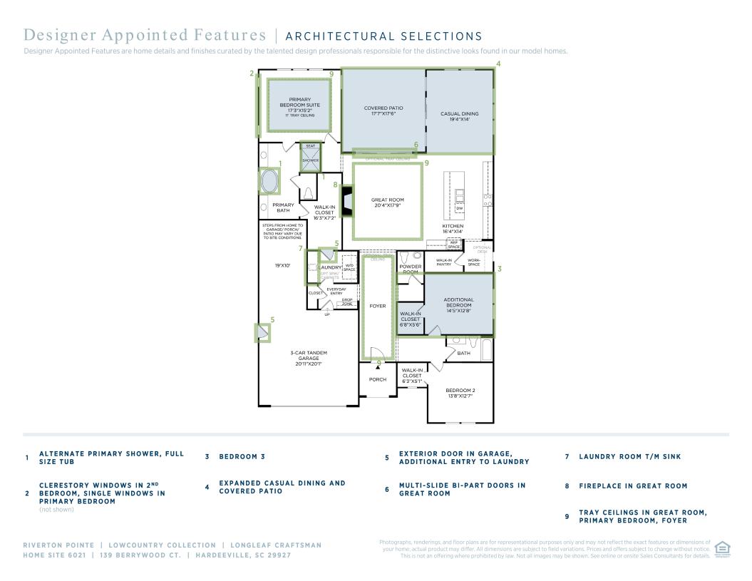 The perfect balance for the everyday and the extraordinary, the Longleaf features open-concept living alongside cozy, quiet spaces. The graceful foyer hallway flows into the expansive great room with desirable large covered patio, open to the casual dining area and well-designed kitchen complete with large center island with breakfast bar, plenty of counter and cabinet space, and roomy walk-in pantry. The charming primary bedroom suite is enhanced by a deluxe walk-in closet and marvelous primary bath with dual vanities, large luxe shower, and private water closet. The secluded secondary bedroom suite features a walk-in closet and private bath. Additional highlights include a flex room off the foyer, thoughtful workspace off the kitchen, convenient powder room and everyday entry, centrally located laundry, and additional storage.