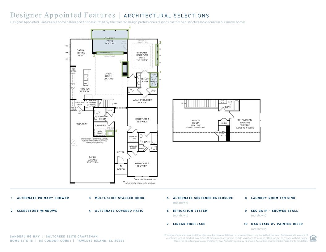 Complete with top-tier design features in a desirable location, this is the home you've always dreamt of. An elongated foyer leads to an open-concept great room and casual dining area with access to a beautiful covered patio, perfect for entertaining. Adjacent, the thoughtfully designed kitchen features a spacious center island with a breakfast bar, a walk-in pantry, and generous counter and cabinet space. Retreat to the first-floor primary bedroom, complete with a large walk-in closet and a lovely primary bath with a dual-sink vanity, a luxe shower, linen storage, and a private water closet. Charming secondary bedrooms offer walk-in closets and share a full bath. Upstairs is a spacious bonus room, a full bath, and unfinished storage space. Other desirable features include an everyday entry with a drop zone, a convenient powder room, centrally located laundry, and plenty of storage space.