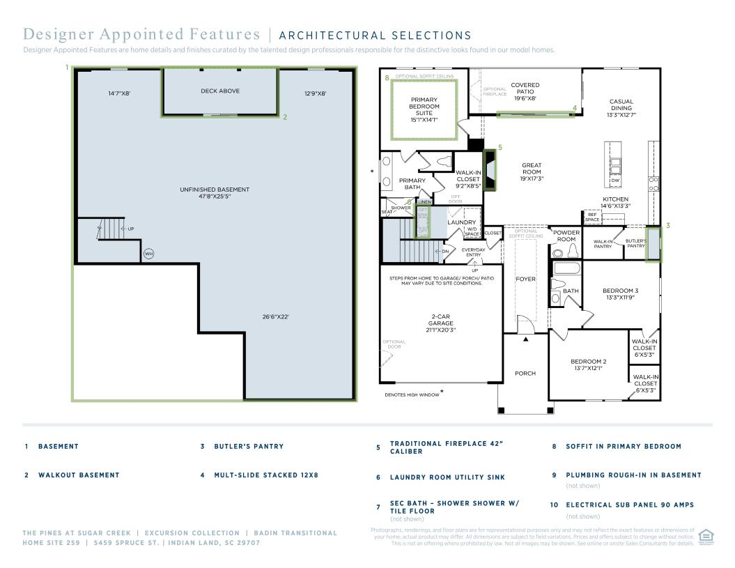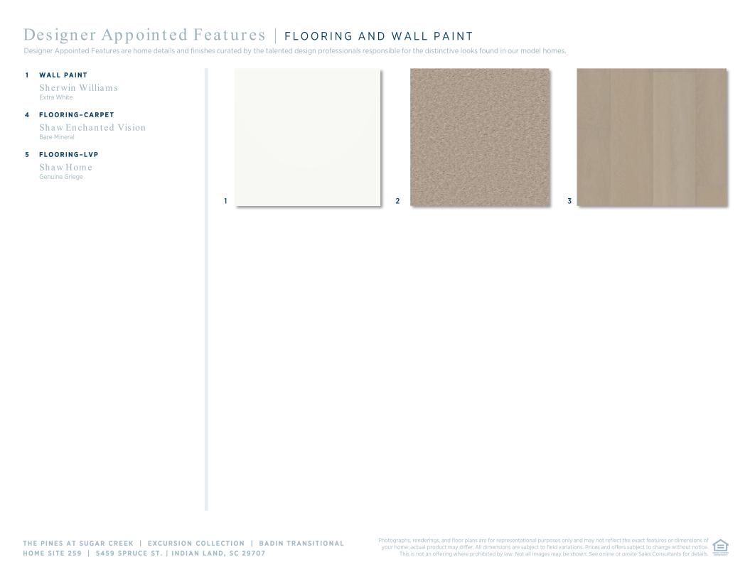 A bright, expansive great room is the heart of the Badin. The casual dining area and large rear covered patio are overlooked by the well-appointed kitchen, complemented by a large center island with breakfast bar, plenty of counter and cabinet space, a sizable walk-in pantry, and a convenient workspace. Highlighting the beautiful primary bedroom suite are an ample walk-in closet and spa-like primary bath with dual vanities, a large luxe shower with seat, linen storage, and a private water closet. Large secondary bedrooms offer versatile entertaining and living options and shared hall bath. Additional highlights include a convenient powder room and everyday entry, easily accessible laundry, and ample additional storage.