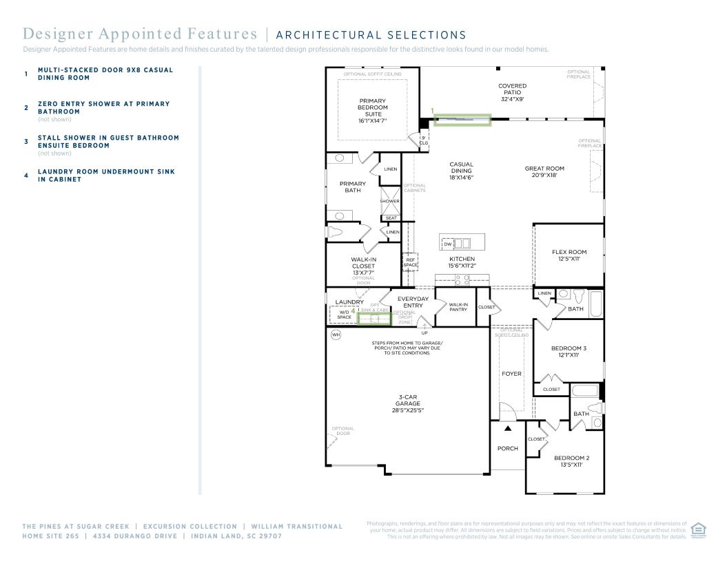 The kitchen is truly the heart of the William home design. Overlooking the expansive great room, casual dining area, and spacious covered patio, the well-appointed kitchen is complete with a large center island with breakfast bar, plenty of counter and cabinet space, and an ample walk-in pantry. Complementing the majestic primary bedroom suite are a large walk-in closet and lovely primary bath with dual vanities, a large luxe shower with seat, linen storage, and a private water closet. Secondary bedrooms, one with private bath, the other with shared hall bath, feature roomy closets. Additional highlights include a generous flex room adjacent to the great room, a convenient everyday entry with adjacent laundry, and ample additional storage.