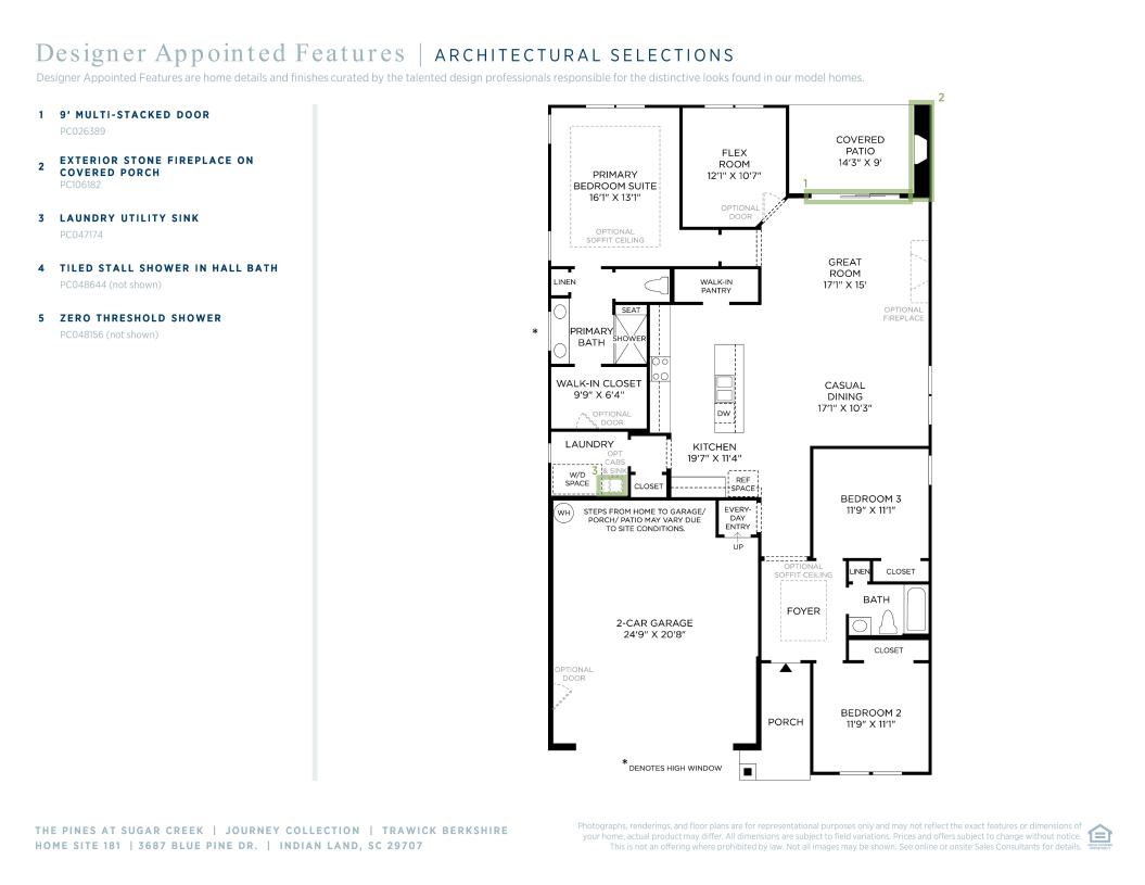 With the kitchen at the heart of the home, the Trawick leaves a lovely impression. The splendid great room and casual dining area are central to the bright foyer, desirable covered patio, and well-designed kitchen offering a large center island with breakfast bar, plenty of counter and cabinet space, and a sizable walk-in pantry. Defining the secluded primary bedroom suite are a spacious walk-in closet and a splendid primary bath with a dual-sink vanity, a large luxe shower with seat, linen storage, and a private water closet. Secondary bedrooms feature ample closets and shared hall bath. Additional highlights include a generous flex room, a convenient everyday entry, an easily-accessible laundry, and plenty of additional storage.
