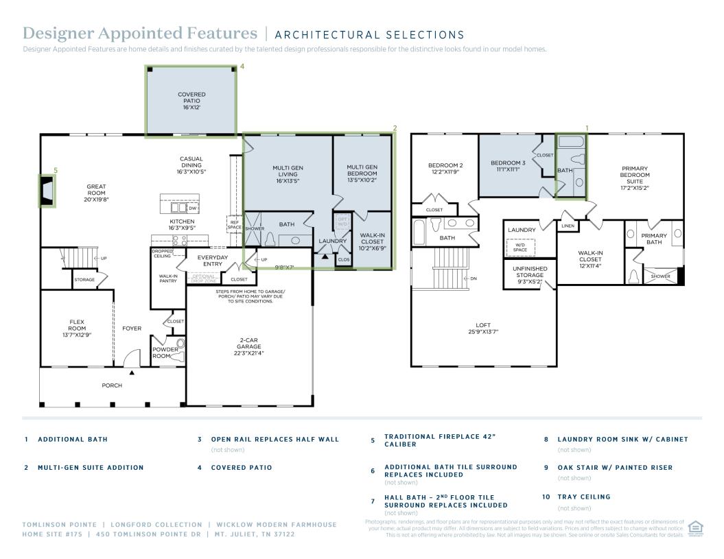 The elegant Wicklow is the perfect blend of private retreats and elegant gathering spaces. A welcoming foyer reveals a bright flex room, an airy great room, and a casual dining area with rear yard access. Adjacent, the beautiful kitchen features an island with breakfast bar, a walk-in pantry, and generous counter and cabinet space. A secluded secondary bedroom with a private bath is ideal for guests. Upstairs, a versatile loft offers endless possibilities as a playroom, hangout, or whatever suits your needs. A wonderful primary bedroom is highlighted by a large walk-in closet and a relaxing primary bath with dual vanities, a luxe shower, and a private water closet. Charming secondary bedrooms, one with a walk-in closet, share a full hall bath. Other highlights include a powder room, everyday entry, conveniently located first-floor laundry, and extra storage throughout.