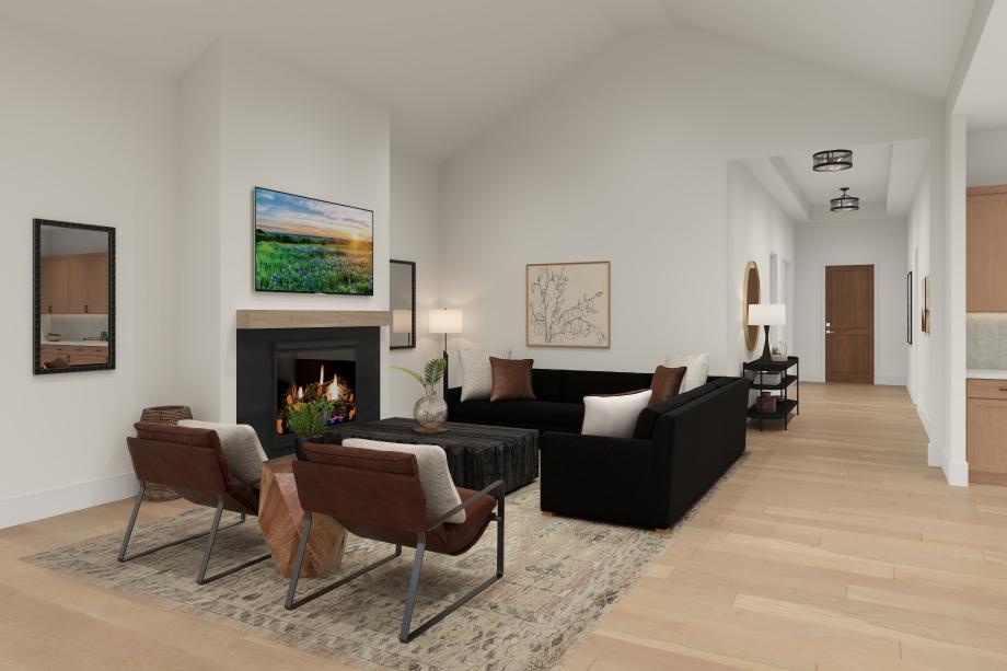 The Henly stuns with its impressive blend of elegance and function. The foyer makes an immediate impression with its striking tray ceiling as it flows seamlessly into a spacious open floor plan. The heart of the home is the great room, boasting a cathedral ceiling and a cozy fireplace that overlooks the well-appointed kitchen. The kitchen is wonderfully enhanced by a central island and adjacent workspace. A casual dining area offers direct access to the covered patio with multi-slide stacked doors, extending your living space outdoors. The luxurious primary bedroom suite includes a tray ceiling, a walk-in closet, and an opulent primary bath with dual sinks, a soaking tub, and a lavish shower. Secondary bedrooms are sizable, two sharing a full bath and one with a private bath. Additional spaces include a versatile flex room, a dedicated office, easily accessible laundry, and ample storage throughout.