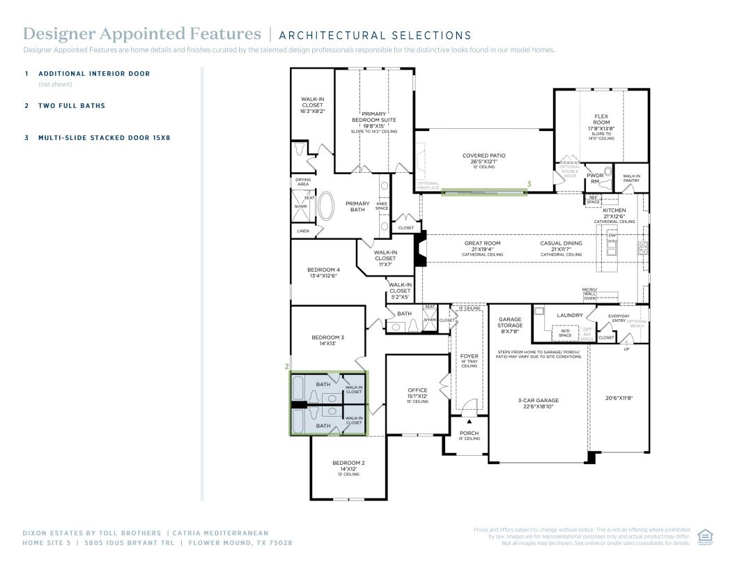 The Catria home design offers a seamless blend of style and functionality. Upon entry, a spacious foyer with an elegant tray ceiling leads to an open-concept main living space highlighted by a cathedral ceiling and features a great room and casual dining area that overlook an expansive covered patio. The well-appointed kitchen boasts a large center island, walk-in pantry, and ample counter and cabinet space. The primary bedroom suite is a true retreat, featuring dual walk-in closets and a luxurious private bath with dual vanities, a private water closet, and a luxe shower with seat. Spacious secondary bedrooms all offer walk-in closets with one featuring a private bath and two sharing a full bath. Additional highlights include private office off the foyer, a versatile flex room, a convenient everyday entry with drop zone, a powder room, and easily accessible laundry.