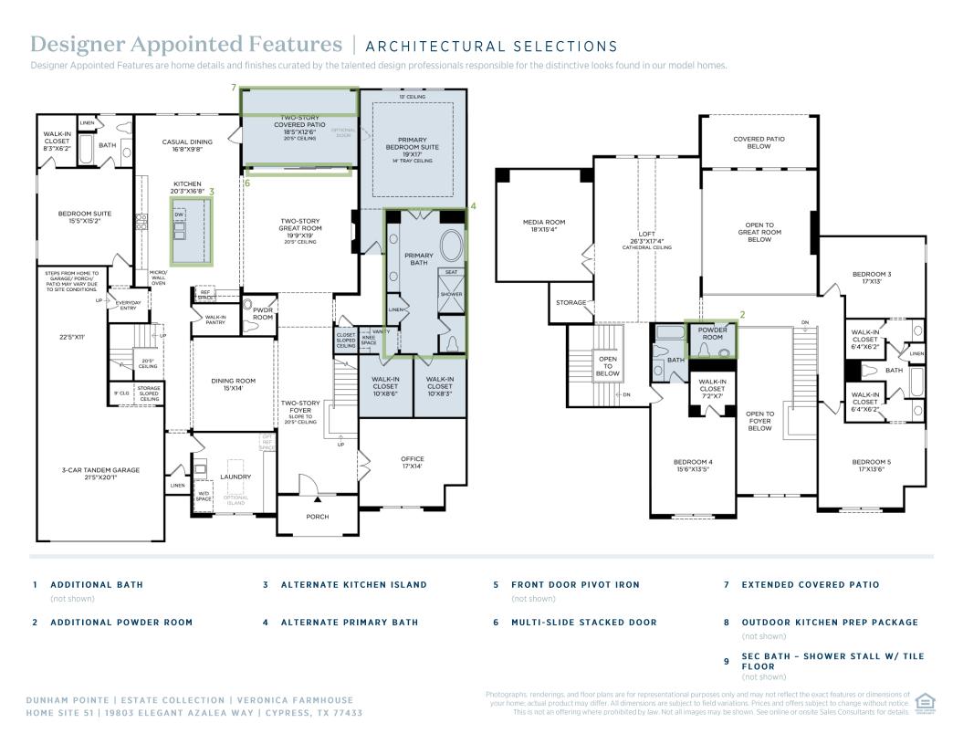 Experience the epitome of luxury with the Veronica's expansive front porch, leading into the impressive two-story foyer. The elegant formal dining room presents views of the spacious great room and stunning two-story rear covered patio. Central to a bright casual dining area is the expertly designed kitchen offering a spacious central island with breakfast bar, ample counter and cabinet space, and an ample walk-in pantry. A generous walk-in closet enhances the beautiful primary bedroom suite that features a serene primary bath complete with a large soaking tub, dual vanities, deluxe shower with seat, linen storage, and private water closet. Vaulted ceilings and adjacent media room highlight a versatile loft space that overlooks the main living area. Secondary bedrooms can be found central to the loft, featuring walk-in closets and shared baths. An additional bedroom suite with walk-in closet and private bath is conveniently located on the first floor. Also featured in the Veronica is private office, a powder room and everyday entry, easily accessible first-floor laundry, and plenty of additional storage.