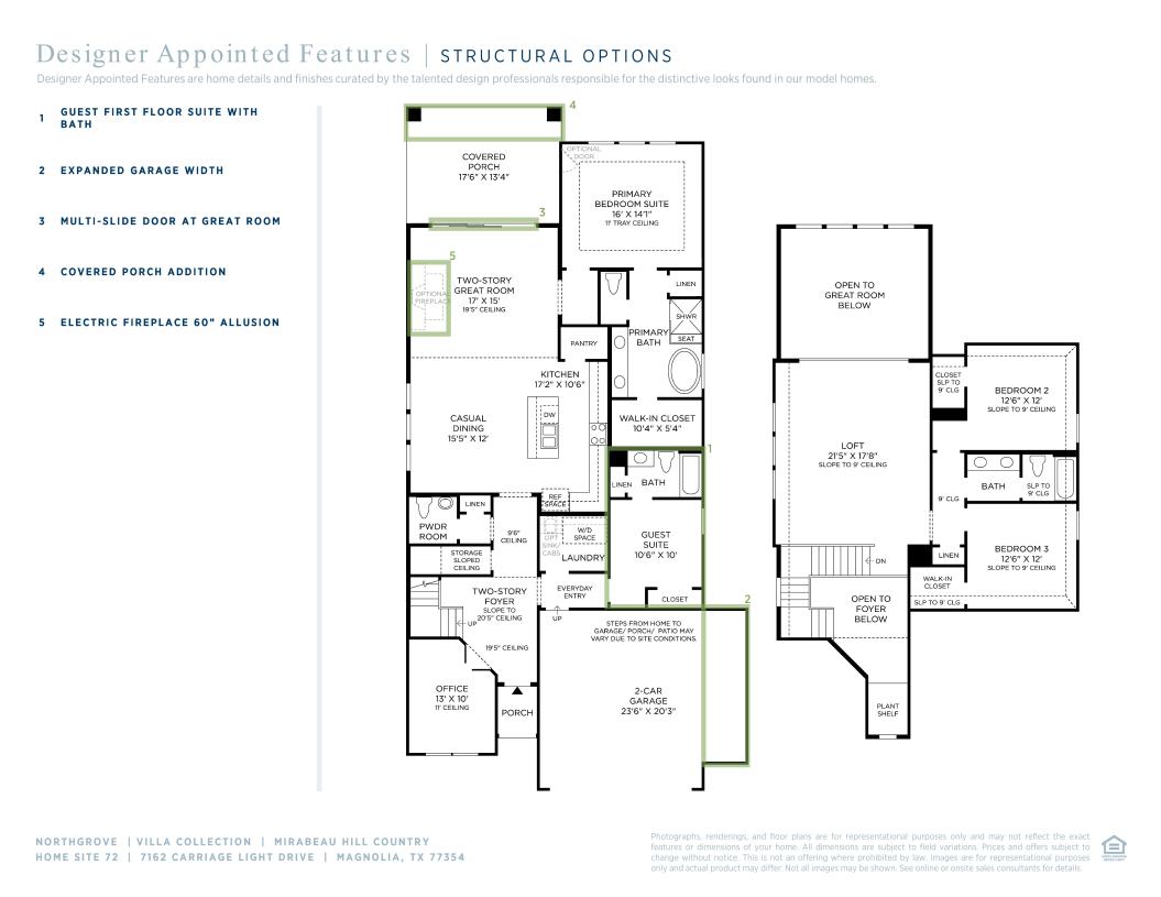 The Mirabeau's welcoming covered porch and stunning two-story foyer open onto the soaring two-story great room and desirable covered patio beyond. The well-appointed kitchen overlooks a bright casual dining area, and is highlighted by a large center island with breakfast bar, plenty of counter and cabinet space, and ample pantry. The majestic primary bedroom suite is enhanced by a beautiful tray ceiling, gigantic walk-in closet, and deluxe primary bath with dual-sink vanity, large soaking tub, luxe shower with seat, linen storage, and private water closet. Central to a generous flex room, secondary bedrooms feature roomy closets and shared full hall bath with separate dual-sink vanity area. Additional highlights include a versatile office off the foyer, convenient powder room and everyday entry, centrally located laundry, and additional storage.