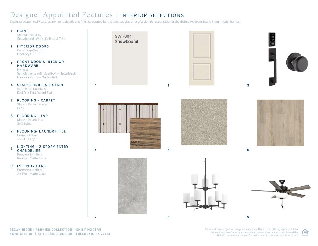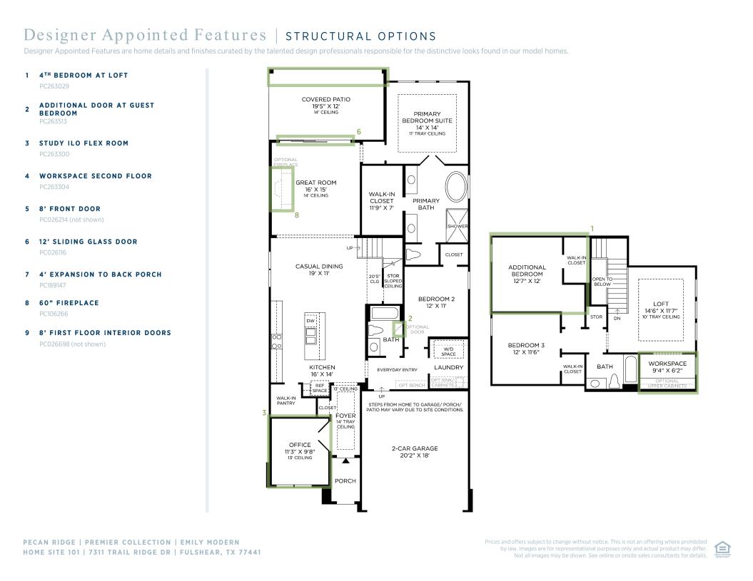 Exquisitely crafted with modern architecture and luxury appointments, the Emily offers a versatile floor plan that fits within every lifestyle. An impressive foyer hallway with a tray ceiling reveals the expansive great room and casual dining area that overlooks a large covered patio. Enhanced by a large center island with breakfast bar, the kitchen is wonderfully designed with plenty of counter and cabinet space, and a sizable walk-in pantry. Defining the alluring primary bedroom suite is a beautiful tray ceiling, a generous walk-in closet, and a marvelous primary bath with dual vanities, a large soaking tub, a luxe shower, and a private water closet. The secondary bedroom features a walk-in closet and a shared hall bath, while an additional bedroom with a walk-in closet and a shared hall bath can be found on the second floor, central to an ample loft with tray ceiling. Additional highlights include a spacious flex room off the foyer, easily accessible laundry off the everyday entry, and additional storage throughout.