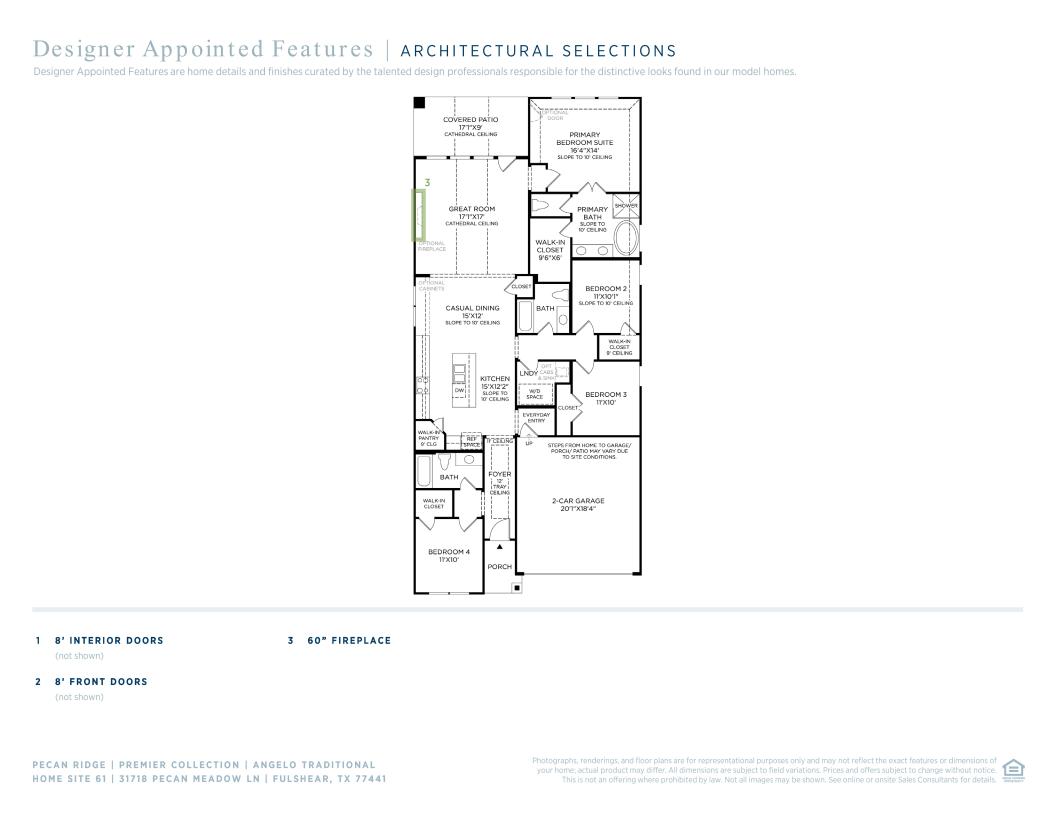 The Angelo's inviting covered porch and elegant foyer with tray ceiling open onto the soaring great room and large covered patio with cathedral ceilings. The well-designed kitchen overlooks a bright casual dining area, and is enhanced by a large center island with breakfast bar, plenty of counter and cabinet space, and roomy walk-in pantry. The charming primary bedroom suite is highlighted by a generous walk-in closet and deluxe primary bath with dual-sink vanity, large soaking tub, luxe shower, and private water closet. Secondary bedrooms feature ample closets and shared full hall bath. Additional highlights include a versatile office and another full hall bath off the foyer, centrally located laundry, and additional storage.