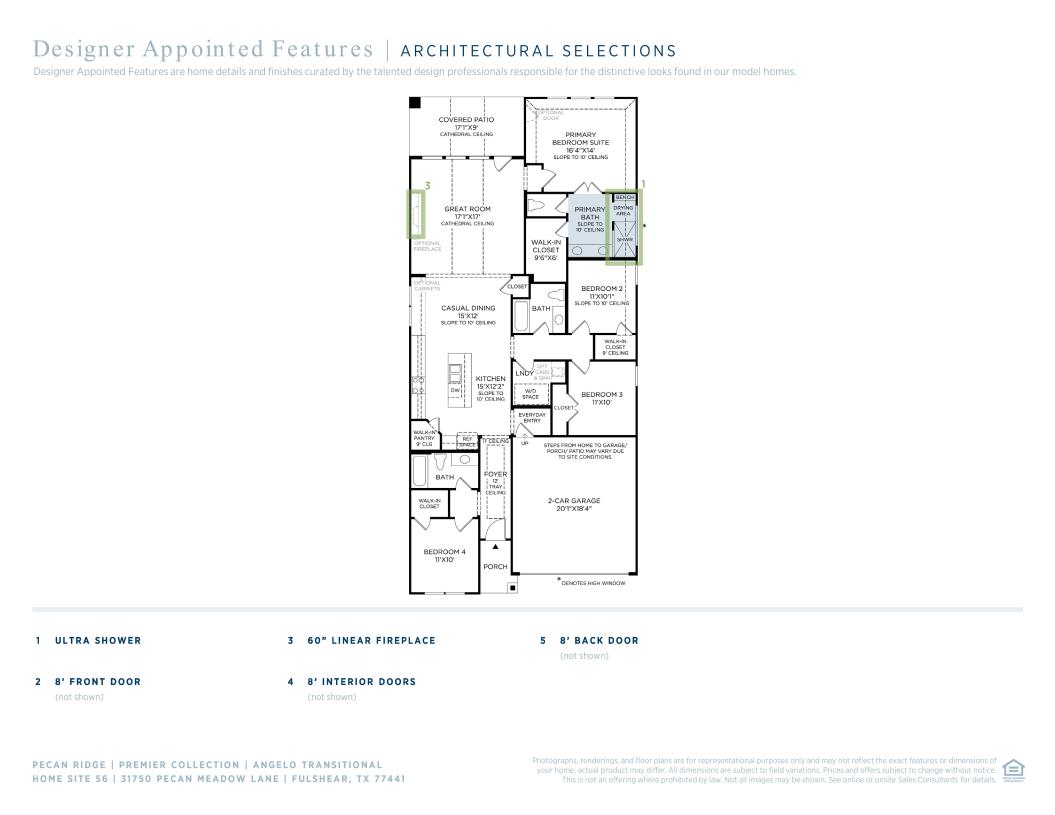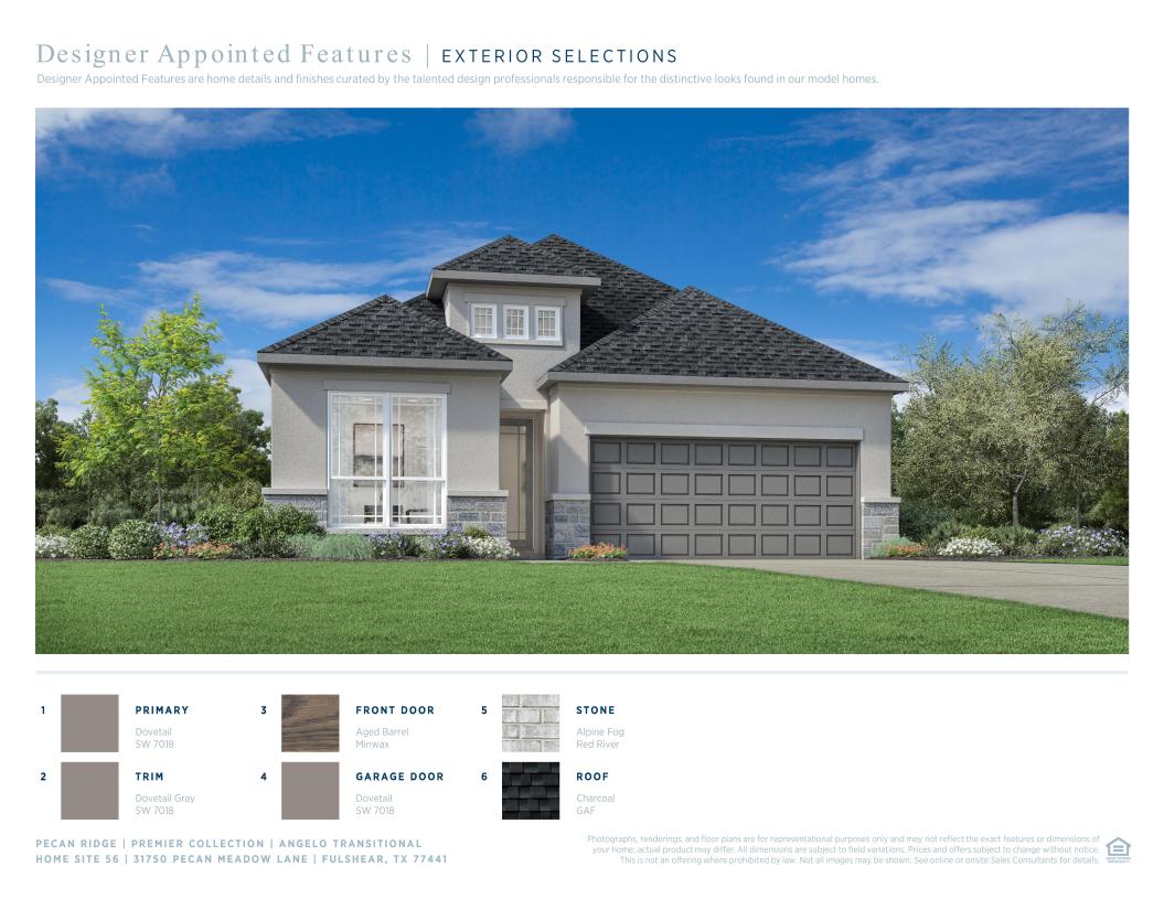 The Angelo's inviting covered porch and elegant foyer with tray ceiling open onto the soaring great room and large covered patio with cathedral ceilings. The well-designed kitchen overlooks a bright casual dining area, and is enhanced by a large center island with breakfast bar, plenty of counter and cabinet space, and roomy walk-in pantry. The charming primary bedroom suite is highlighted by a generous walk-in closet and deluxe primary bath with dual-sink vanity, large soaking tub, luxe shower, and private water closet. Secondary bedrooms feature ample closets and shared full hall bath. Additional highlights include a versatile office and another full hall bath off the foyer, centrally located laundry, and additional storage.