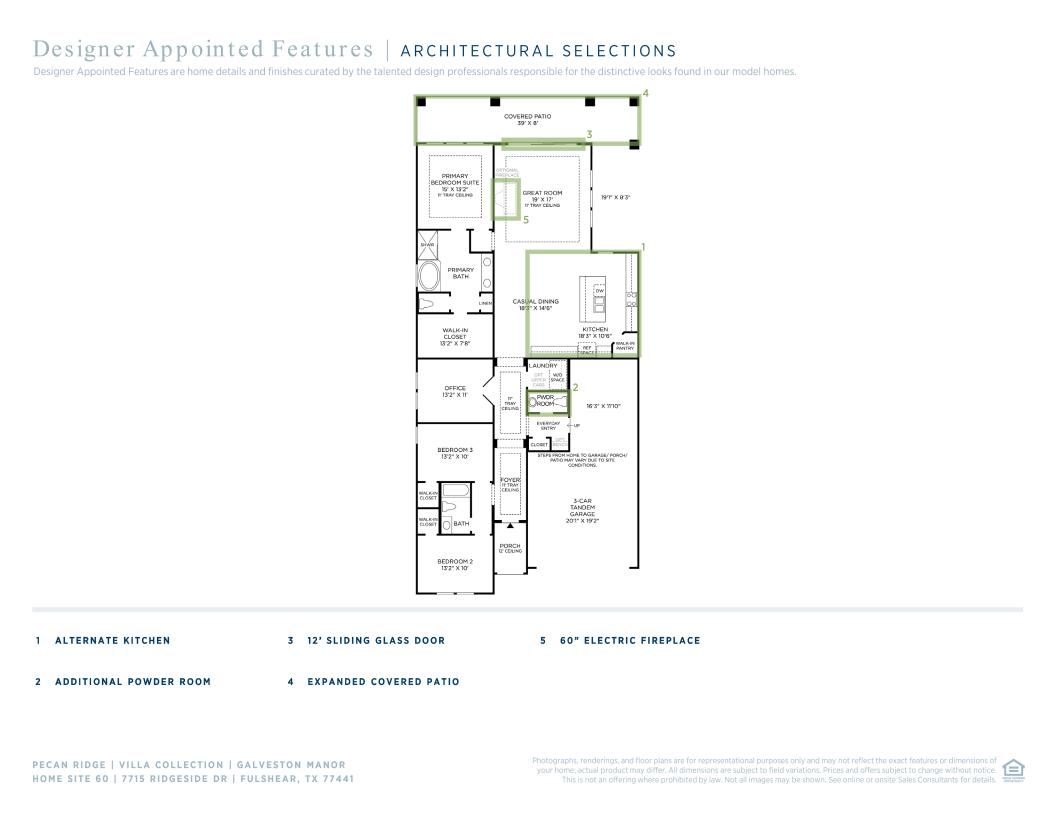 Elegant contemporary elements. The Galveston's welcoming covered porch entry and inviting foyer hallway with tray ceilings reveal views to the bright casual dining area, spacious great room with tray ceiling, and desirable covered patio beyond. The well-designed gourmet kitchen is enhanced by a large center island with breakfast bar, plenty of counter and cabinet space, and generous walk-in pantry. The graceful primary bedroom suite is highlighted by a lovely tray ceiling, massive walk-in closet, and deluxe primary bath with dual-sink vanity, large soaking tub, luxe shower, and private water closet. Secondary bedrooms feature walk-in closets and shared hall bath. Additional highlights include a versatile office, convenient everyday entry, centrally located laundry, and additional storage.