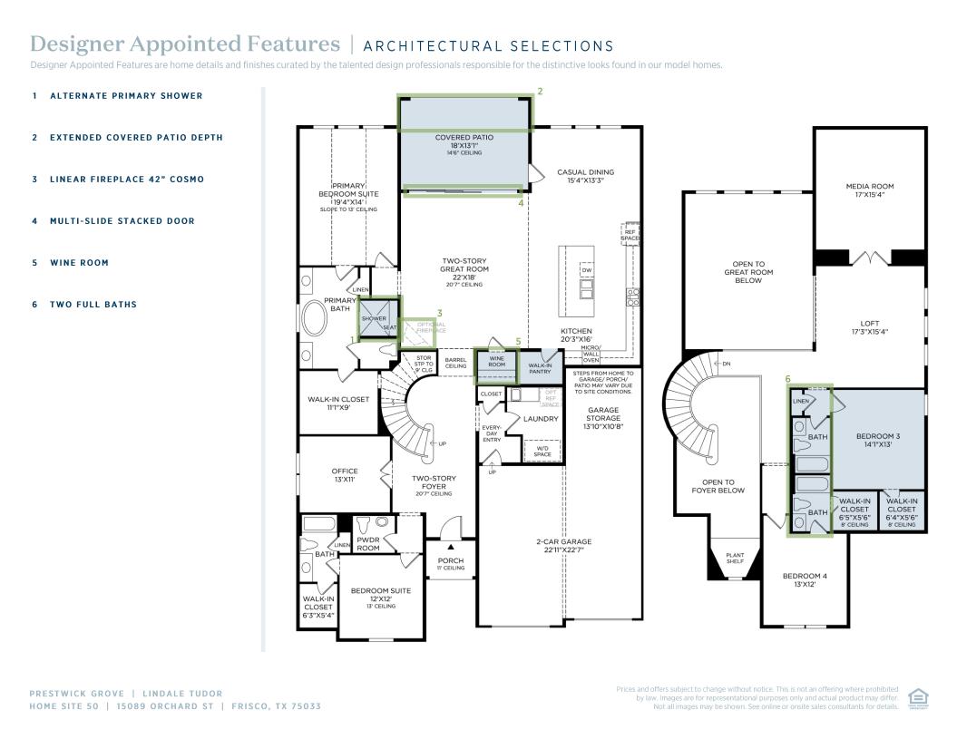 Luxurious modern lifestyle. The Lindale's welcoming covered porch and stunning two-story foyer with circular stairs reveal the soaring two-story great room, and views to the desirable covered patio beyond. The well-equipped gourmet kitchen overlooks a bright casual dining area, and is complete with a large center island with breakfast bar, plenty of counter and cabinet space, and huge walk-in pantry. The palatial primary bedroom suite is highlighted by a massive walk-in closet and deluxe primary bath with dual-sink vanity, large soaking tub, luxe shower, linen storage, and private water closet. Central to a generous flex room and versatile media room, secondary bedrooms feature walk-in closets and shared bath with separate vanity areas. Additional highlights include a versatile office off the foyer, convenient powder room, centrally located laundry, and additional storage.