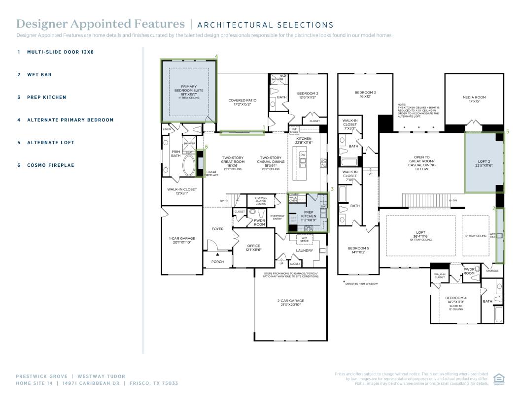 The Westway home design artfully balances refined luxury with everyday functionality—ideal for both relaxed living and effortless entertaining. The welcoming foyer reveals a dramatic two-story great that seamlessly flows into a casual dining area with easy access to a spacious covered patio for year-round outdoor enjoyment. The gourmet kitchen is thoughtfully designed with a generous center island, ample counter space, and a walk-in pantry—perfect for hosting gatherings or preparing everyday meals. Privately situated on the main level, the elegant primary bedroom suite features a stylish tray ceiling, a sizable walk-in closet and a spa-like bath with a dual-sink vanity, a soaking tub, a luxe shower, and a private water closet. Additional first-floor highlights include a lovely secondary bedroom suite, a quiet home office, a convenient laundry space with a linen closet, two separate garages—one two-car and one single-car—and a practical everyday entry. Upstairs, a versatile loft enhanced by a tray ceiling overlooks the great room below, while a media room provides the perfect setting for movie nights or family fun. Two generously sized secondary bedrooms with walk-in closets feature private baths, and another secondary bedroom features a walk-in closet and access to a shared full hall bath.