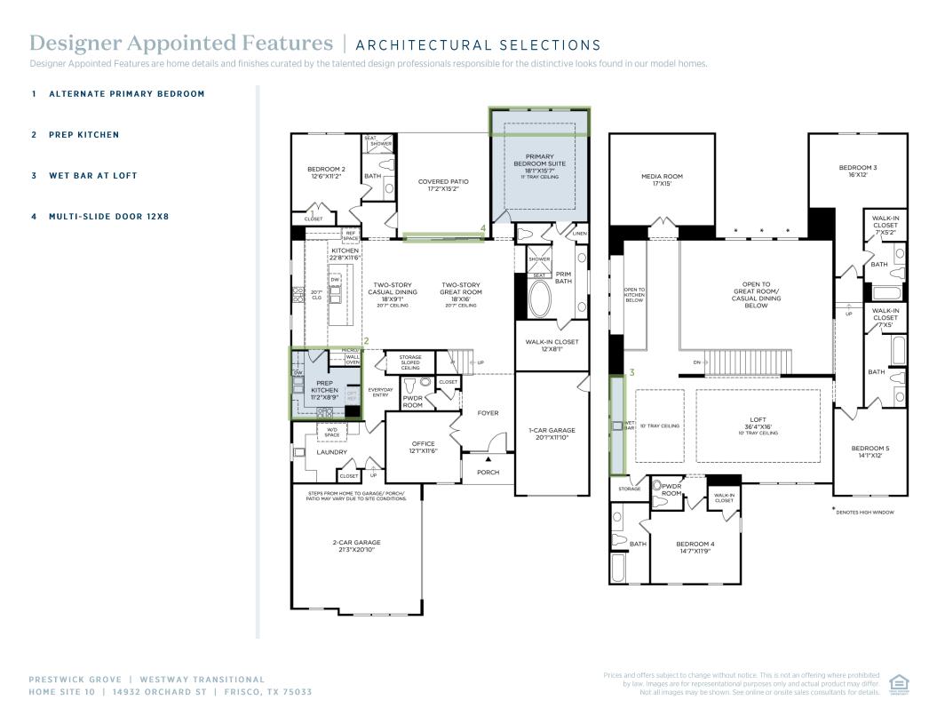 The Westway home design artfully balances refined luxury with everyday functionality—ideal for both relaxed living and effortless entertaining. The welcoming foyer reveals a dramatic two-story great that seamlessly flows into a casual dining area with easy access to a spacious covered patio for year-round outdoor enjoyment. The gourmet kitchen is thoughtfully designed with a generous center island, ample counter space, and a walk-in pantry—perfect for hosting gatherings or preparing everyday meals. Privately situated on the main level, the elegant primary bedroom suite features a stylish tray ceiling, a sizable walk-in closet and a spa-like bath with a dual-sink vanity, a soaking tub, a luxe shower, and a private water closet. Additional first-floor highlights include a lovely secondary bedroom suite, a quiet home office, a convenient laundry space with a linen closet, two separate garages—one two-car and one single-car—and a practical everyday entry. Upstairs, a versatile loft enhanced by a tray ceiling overlooks the great room below, while a media room provides the perfect setting for movie nights or family fun. Two generously sized secondary bedrooms with walk-in closets feature private baths, and another secondary bedroom features a walk-in closet and access to a shared full hall bath.