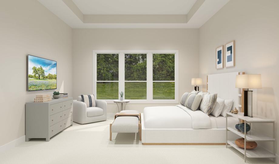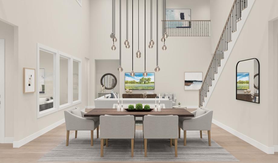 The Westway home design artfully balances refined luxury with everyday functionality—ideal for both relaxed living and effortless entertaining. The welcoming foyer reveals a dramatic two-story great that seamlessly flows into a casual dining area with easy access to a spacious covered patio for year-round outdoor enjoyment. The gourmet kitchen is thoughtfully designed with a generous center island, ample counter space, and a walk-in pantry—perfect for hosting gatherings or preparing everyday meals. Privately situated on the main level, the elegant primary bedroom suite features a stylish tray ceiling, a sizable walk-in closet and a spa-like bath with a dual-sink vanity, a soaking tub, a luxe shower, and a private water closet. Additional first-floor highlights include a lovely secondary bedroom suite, a quiet home office, a convenient laundry space with a linen closet, two separate garages—one two-car and one single-car—and a practical everyday entry. Upstairs, a versatile loft enhanced by a tray ceiling overlooks the great room below, while a media room provides the perfect setting for movie nights or family fun. Two generously sized secondary bedrooms with walk-in closets feature private baths, and another secondary bedroom features a walk-in closet and access to a shared full hall bath.