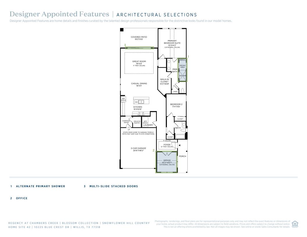 The Snowflower pairs elegance and comfort for luxurious everyday living. A gorgeous foyer with a tray ceiling flows into an open-concept layout that connects the kitchen, casual dining area, and great room, enhanced by a tray ceiling. The kitchen features a center island, walk-in pantry, and ample counter space. Just off the great room, a covered patio extends the living space outdoors for year-round enjoyment. The primary suite is a luxurious retreat with a cathedral ceiling, spacious walk-in closet, and a private bath with dual-sink vanity, shower with seat, and private water closet. A secondary bedroom with access to a full hall bath provides comfort for guests or family. Additional highlights include a versatile flex room, laundry area, and everyday entry for added convenience.