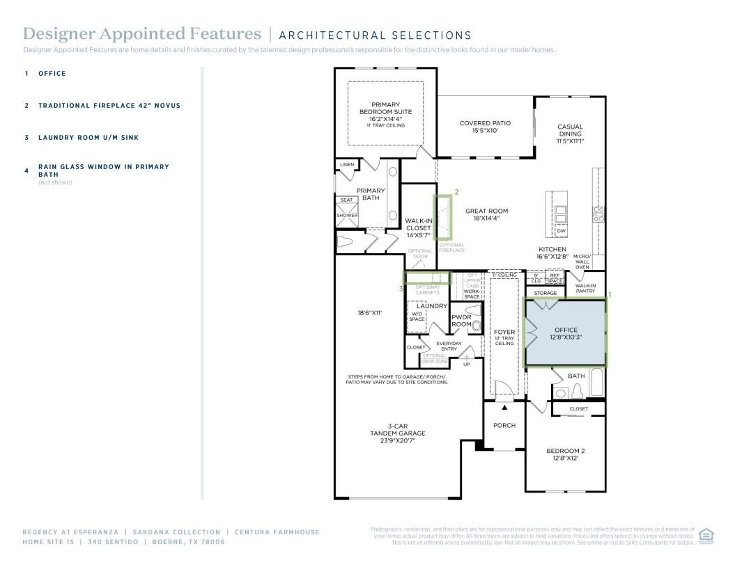 The stunning Centura offers flexibility and elegant modern living. A beautiful foyer with a tray ceiling reveals an expansive great room and serene covered patio. Overlooked by an intimate casual dining area, the well-designed kitchen is complete with a large center island with breakfast bar, plenty of counter and cabinet space, and a roomy walk-in pantry. Highlighting the private primary bedroom suite is a lovely tray ceiling, an ample walk-in closet, and a charming primary bath with dual-sink vanity, a large luxe shower, linen storage, and a private water closet. The secondary bedroom feature a sizable closet and a shared hall bath. Additional highlights include a generous flex room, a useful workspace, convenient everyday entry and powder room, centrally located laundry, and additional storage.