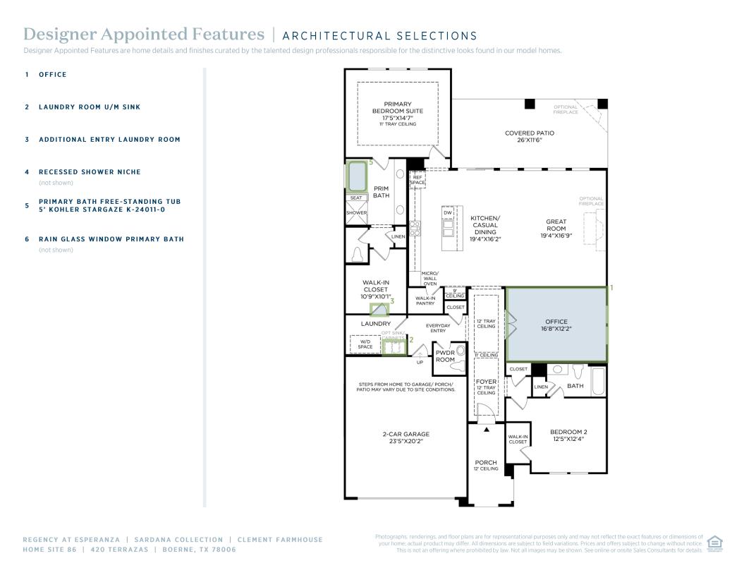 The Clement offers space for everything that matters. The elegant foyer hallway with tray ceilings flows past a spacious flex room, and opens onto the charming great room with covered patio beyond. The well-designed kitchen is highlighted by a bright casual dining area, large center island with breakfast bar, plenty of counter and cabinet space, and a roomy walk-in pantry. The gorgeous primary bedroom suite is complemented by a graceful tray ceiling, a generous walk-in closet, and a lovely primary bath with dual-sink vanity, a large luxe shower with seat, and a private water closet. The large secondary bedroom features a walk-in closet and private bath with linen storage. Additional highlights include a convenient powder room and everyday entry with adjacent laundry, and plenty of additional storage.
