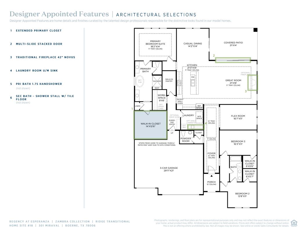 With ample space for entertaining and relaxing retreats throughout, the Ridge is perfectly balanced for all of life's moments. The long, elegant foyer hallway with tray ceilings flows past a large flex room and into the spacious great room with tray ceiling and views to the large covered patio beyond. Complementing the well-designed kitchen are a bright casual dining area, a large center island with breakfast bar, plenty of counter and cabinet space, and a sizable walk-in pantry. The charming primary bedroom suite is enhanced by an elegant tray ceiling, an ample walk-in closet, and a gracious primary bath with dual vanities, a large luxe shower with seat, linen storage, and a private water closet. Secondary bedrooms feature walk-in closets and shared hall bath. Additional highlights include a generous flex room, a convenient workspace, a powder room, an everyday entry, a centrally located laundry, and ample additional storage.