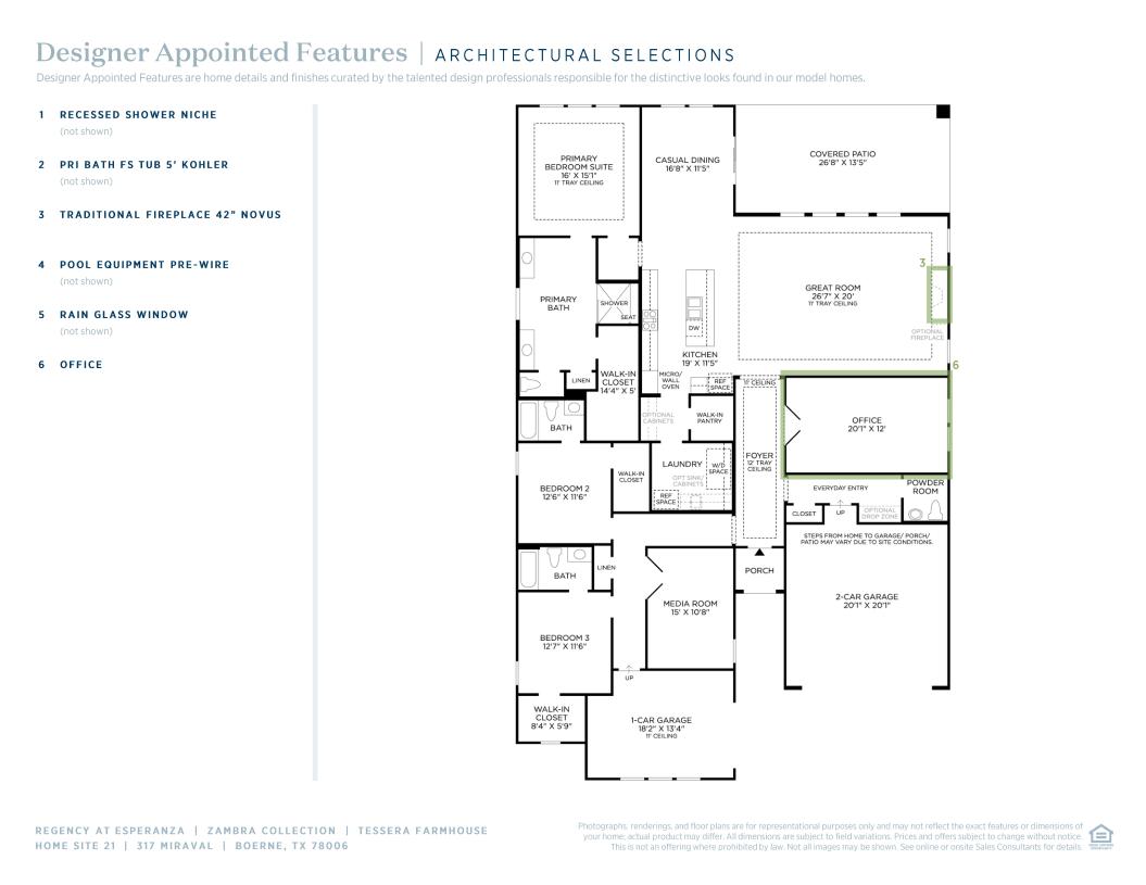 Beautifully designed to make an impression, the Tessera features an expansive great room with tray ceiling, a lovely focal point for the main living areas. Overlooking a large covered patio, the airy casual dining area is set alongside the well-designed kitchen, offering a large center island with breakfast bar, plenty of counter and cabinet space, a convenient workspace, and a sizable walk-in pantry. Defining the superb primary bedroom suite are a beautiful tray ceiling, a generous walk-in closet, and a splendid primary bath with dual vanities, a large luxe shower with seat, linen storage, and a private water closet. Secondary bedrooms feature walk-in closets and private baths, and are central to an ample media room. Additional highlights include a spacious flex room, a convenient powder room, an everyday entry, a centrally located laundry, and plenty of additional storage.