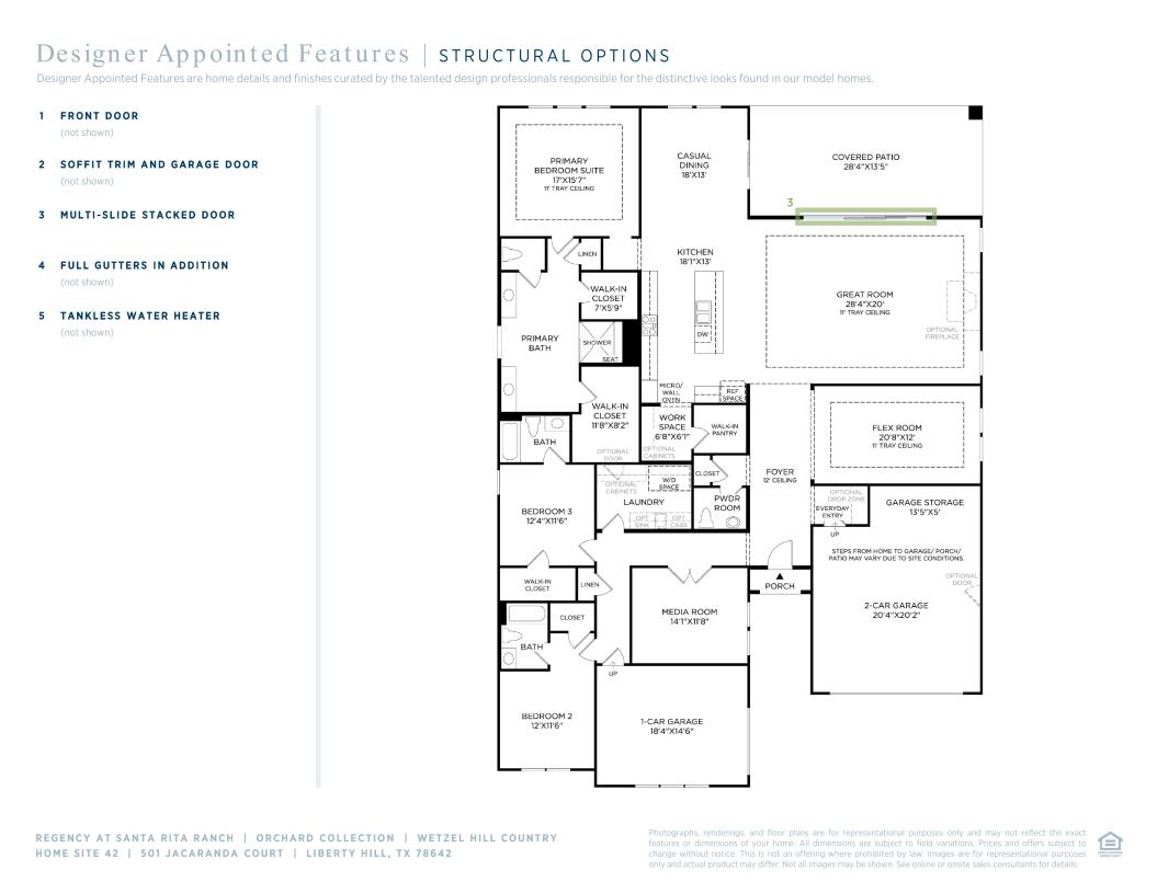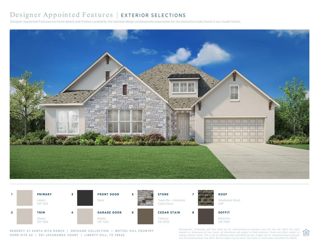 From its elegant foyer to its spacious covered patio, to the luxurious primary bedroom suite, the Wetzel is ideally designed to make the most of everyday living. The expansive great room and casual dining area overlook the desirable large covered patio making entertaining a breeze in this home. The kitchen features a large center island with breakfast bar, plenty of counter and cabinet space, a large workspace, and a sizable walk-in pantry. Enhancing the marvelous primary bedroom suite are a charming tray ceiling, dual walk-in closets, and a spa-like primary bath with dual vanities, large luxe shower, linen storage, and private water closet. Secondary bedrooms feature ample closets and private baths. Additional highlights include a secluded media room off the foyer, convenient powder room and everyday entry, centrally located laundry, and additional storage.