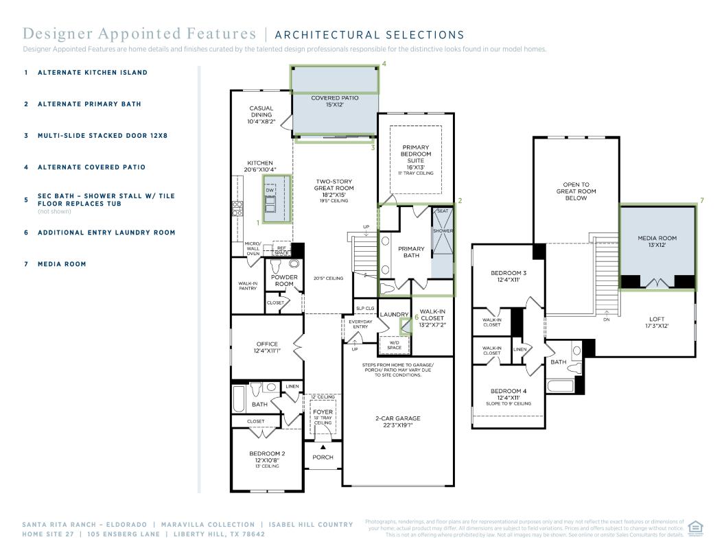 The Isabel offers a graceful balance of elegance and everyday functionality across two thoughtfully designed levels. A welcoming foyer with a tray ceiling sets the tone, leading into an expansive open-concept living area. At the heart of the home, a two-story great room flows into the kitchen—complete with a center island and walk-in pantry—and a casual dining area that opens to a covered patio for effortless indoor-outdoor living. The main level also features a versatile office and a private primary suite with a tray ceiling, spacious walk-in closet, and a spa-inspired bath that includes dual-sink vanity, a soaking tub, a separate shower, and a private water closet. A secondary bedroom near a full hall bath provides a comfortable retreat for guests or extended stays. Upstairs, a central loft offers flexible space for work, play, or relaxation, while two additional secondary bedrooms with walk-in closets share a full bath. Additional highlights include a first-floor laundry area, powder room, and an everyday entry for added convenience.