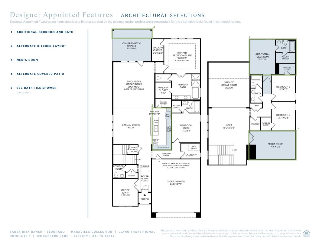 The Llano offers a stylish and open layout designed for modern living. A tray-ceiling foyer welcomes you into the heart of the home, where a beautiful casual dining area, a well-equipped kitchen, and a dramatic two-story great room come together for seamless gathering and relaxation. The kitchen includes a center island and a walk-in pantry—perfect for both everyday meals and entertaining. Just beyond, a covered patio extends the living space outdoors. The main-floor primary suite features a tray ceiling, dual walk-in closets, and a spa-inspired bath with a dual-sink vanity, soaking tub, separate shower, and private water closet. Upstairs, two secondary bedrooms share a full hall bath and are complemented by a central loft overlooking the great room. Additional highlights include a first-floor laundry area, powder room, everyday entry, and a dedicated office.
