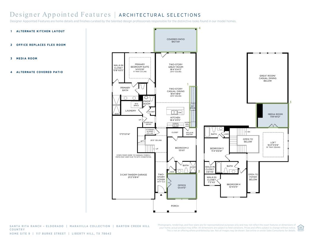 The Barton Creek home design blends luxury and functionality in a spacious two-story layout. A soaring two-story foyer opens to a dramatic great room and casual dining area, seamlessly connected to the gourmet kitchen with a center island and walk-in pantry. Just beyond, a covered patio expands the living space outdoors. The main level also features a versatile flex room and a lavish primary suite with a tray ceiling, large walk-in closet, and spa-inspired bath with a dual-sink vanity, shower with seat, and private water closet. A secondary bedroom with a private bath offers comfort and privacy for guests. A convenient laundry room completes the first floor. Upstairs, a central loft provides additional living space and is surrounded by two secondary bedrooms with walk-in closets—one with a private bath, the other with access to a full hall bath.