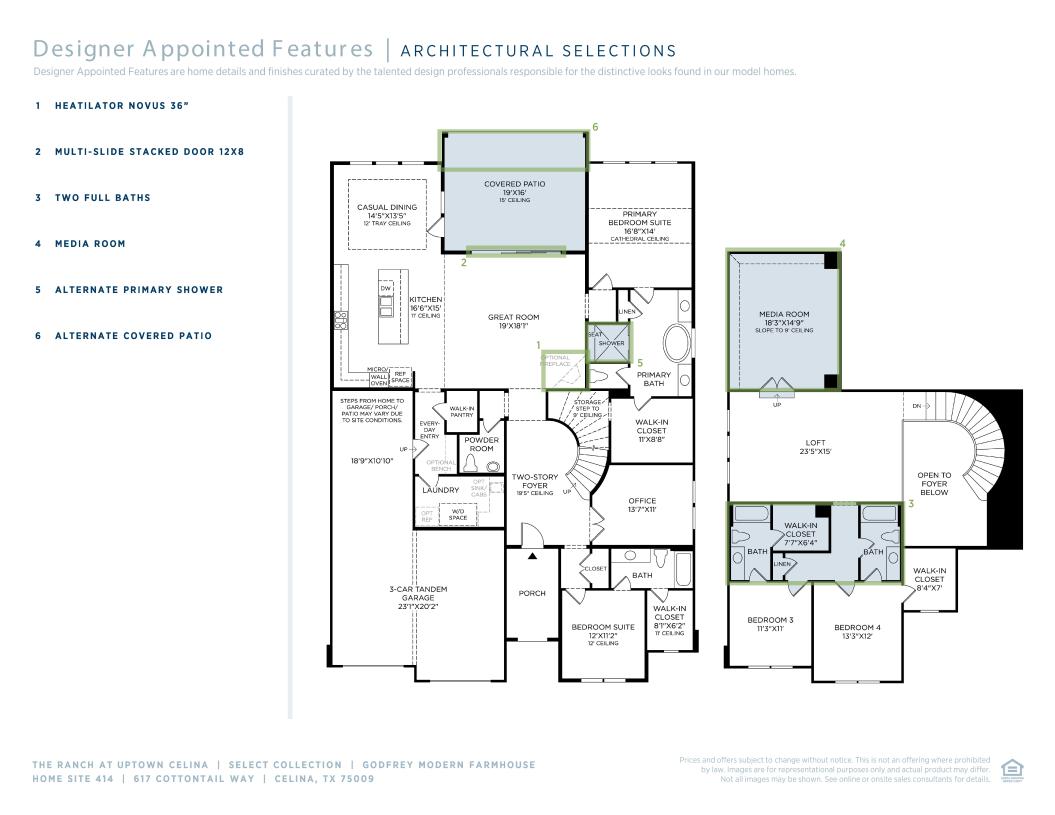 The Godfrey features stunning architectural details for elevated living. A soaring two-story foyer reveals an elegant spiral staircase and a spacious great room that flows seamlessly into a casual dining area with tray ceiling and a covered patio. The well-appointed kitchen boasts a large center island, wraparound counters and cabinets, and a walk-in pantry. The sophisticated primary bedroom is complete with a cathedral ceiling, a walk-in closet, and an opulent bathroom featuring dual vanities, a relaxing soaking tub, a luxurious shower, linen storage, and a private water closet. An office and secondary bedroom suite add extra living and working space to the first floor. Upstairs, a versatile loft provides an additional living area, while two secondary bedrooms that share a full bath with private vanity areas offer comfortable accommodations for family or guests. Other highlights include an everyday entry, convenient first-floor laundry, a first-floor powder room, and plentiful storage.