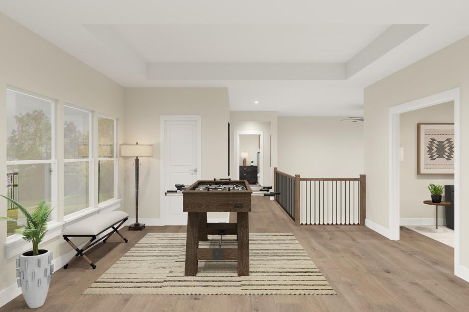 The Pecan showcases a stunning two-story floor plan that seamlessly blends style and comfort. The heart of the home is an impressive two-story great room that overlooks a casual dining area and a spacious covered patio. The kitchen is expertly crafted, boasting a large center island and a sizable walk-in pantry. The first level also features a versatile flex room off the foyer. Upstairs, the luxurious primary bedroom suite showcases a tray ceiling, an expansive walk-in closet, and an opulent private bath complete with dual sinks, a freestanding tub, a luxe shower with seat, and a private water closet. Two secondary bedrooms share a full bath and are central to a versatile loft with a tray ceiling and a media room. An additional secondary bedroom is conveniently located on the first floor, offering a roomy closet and shared hall bath. Also featured in the Pecan is second-level laundry and plenty of storage throughout.