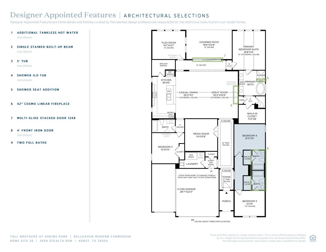 The Bellhaven blends classic design and modern convenience in a gorgeous single-story layout. From the welcoming foyer, the great room and casual dining area open under a cathedral ceiling and flow to a large covered patio—ideal for indoor-outdoor living. Nearby, the gourmet kitchen features a center island with breakfast bar, L-shaped counter space, and a walk-in pantry. The primary bedroom suite features a cathedral ceiling, a spacious walk-in closet, and a spa-inspired bath with dual vanities, a soaking tub, a luxe shower with seat, and a private water closet. Three secondary bedrooms—two sharing a bath and one with access to a hall bath—offer room for family and guests. Additional highlights include a rear flex room, central media room, everyday entry, and laundry space.