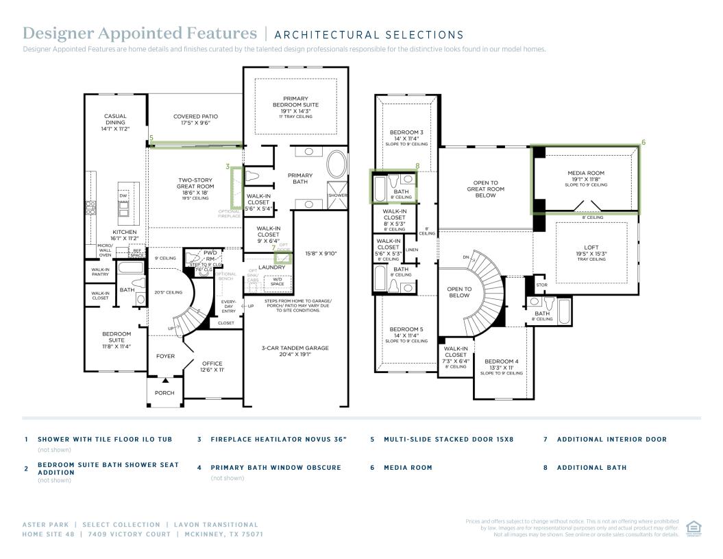 The Lavon’s impressive design and thoughtful details set the stage for elegant, modern living. The foyer makes a grand impression as it flows past a secluded office, a bedroom suite, and a stunning circular staircase. The great room and bright casual dining area overlook a well-designed kitchen featuring a large center island with breakfast bar, plenty of counter and cabinet space, and sizable walk-in pantry. The primary bedroom suite is enhanced by a gorgeous tray ceiling, dual walk-in closets, and a marvelous primary bath with dual vanities, a relaxing soaking tub, a luxe shower, and a private water closet. Upstairs, a spacious loft connects to three additional secondary bedrooms featuring walk-in closets. One of these bedrooms offers a private bath, and two have a shared hall bath. Additional highlights include a convenient powder room and everyday entry, centrally located laundry, and additional storage throughout.