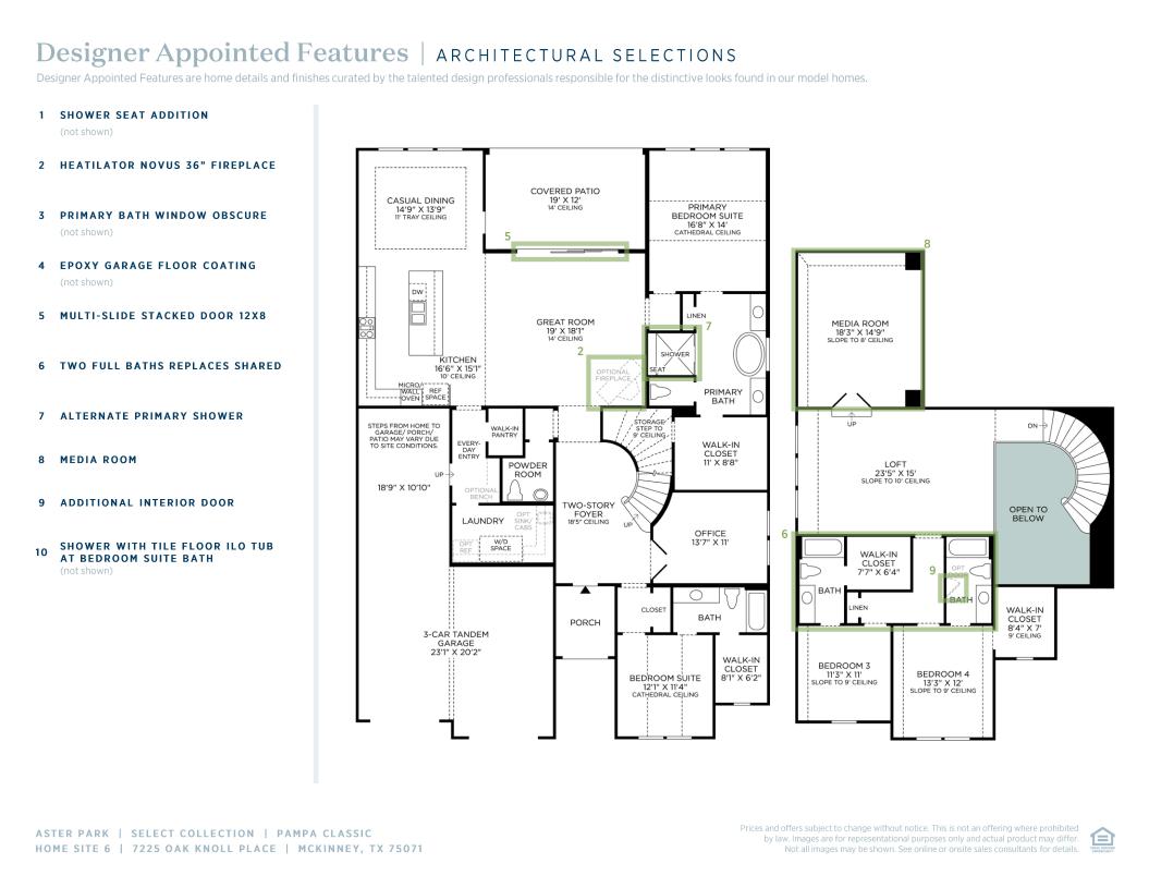The Pampa epitomizes luxury within its expansive two-story floor plan. A stunning two-story foyer with elegant curved stairs flows seamlessly into the great room and a casual dining area with tray ceiling that offers views of the desirable covered patio beyond. The well-designed kitchen is highlighted by a large center island with breakfast bar, plenty of counter and cabinet space, and a sizable walk-in pantry. Secluded on the first floor, the marvelous primary bedroom suite is enhanced by a cathedral ceiling, a spacious walk-in closet, and a lush private bath complete with dual vanities, a freestanding tub, a luxe shower, and a private water closet. On the second level, two secondary bedrooms feature walk-in closets and a shared full bath and are central to a generous loft space. An additional bedroom suite with a walk-in closet and a private bath is conveniently located off the foyer. Also offered in the Pampa is a private office, convenient powder room and everyday entry, easily accessible laundry, and additional storage.