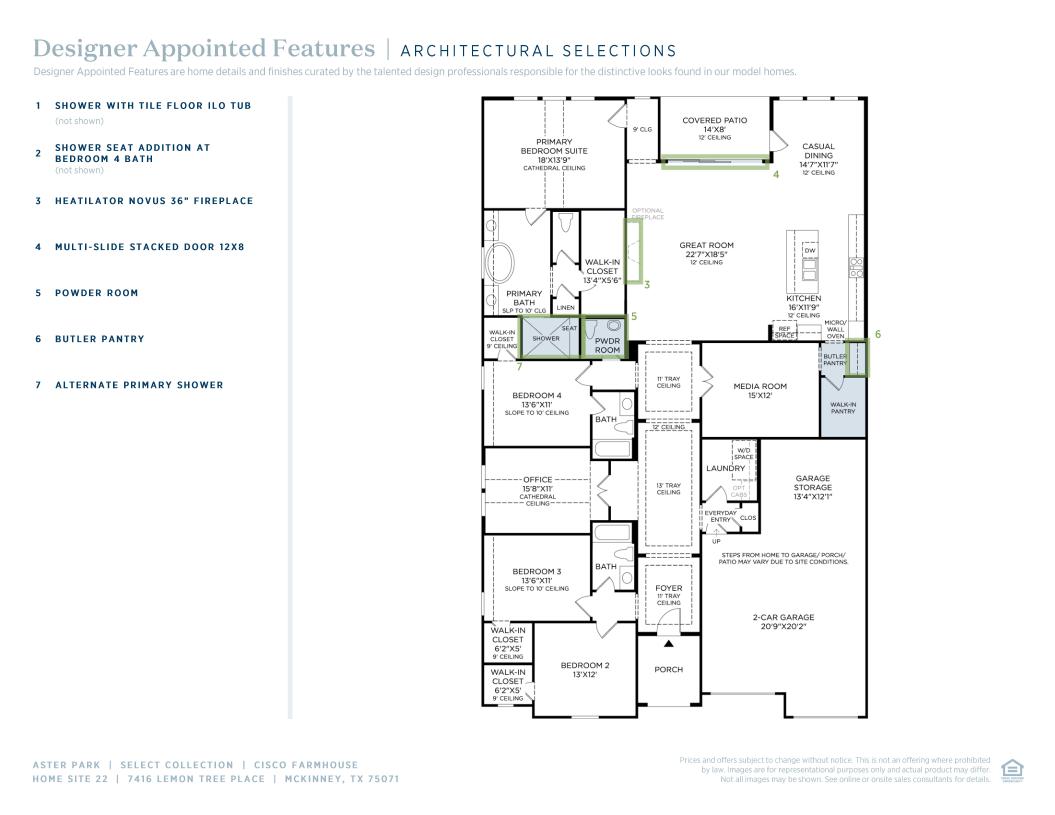 The Cisco's inviting porch and elegant foyer hallway with tray ceilings flow into the expansive great room, offering views to the desirable covered patio. The well-equipped kitchen overlooks a bright casual dining area, and is enhanced by a large center island with breakfast bar, plenty of counter and cabinet space, and generous walk-in pantry. The magnificent primary bedroom suite is complete with palatial walk-in closet and deluxe primary bath with dual vanities, large soaking tub, luxe shower, linen storage, and private water closet. Secondary bedrooms feature sizable closets, two with shared hall bath, one with private bath. Additional highlights include a generous office, spacious media room, convenient everyday entry, centrally located laundry, and additional storage.