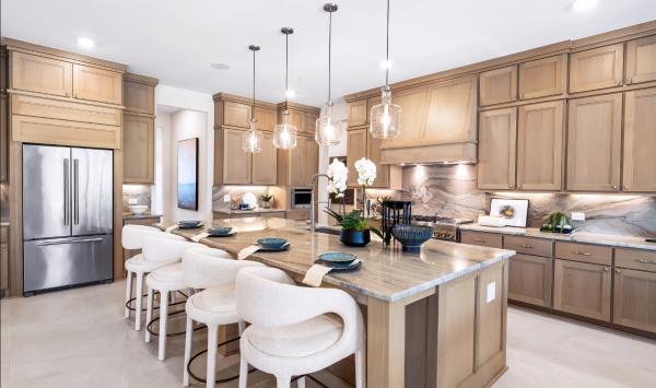 Luxurious kitchens with oversized islands, pendant lighting, and stainless steel appliances