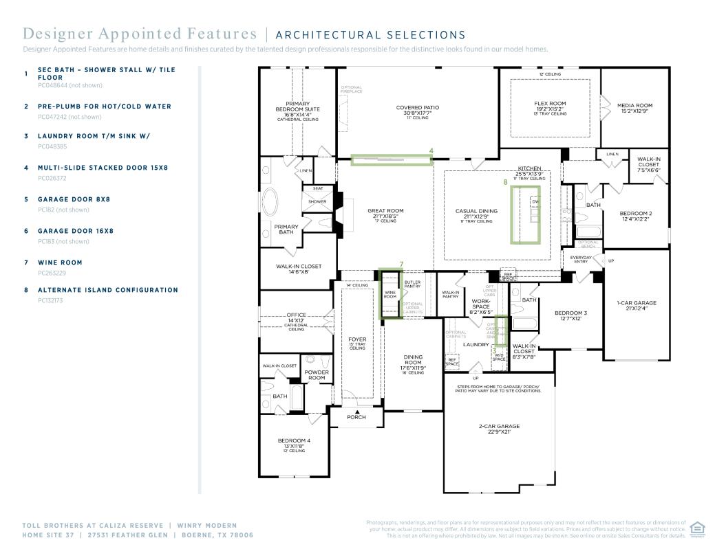 Experience effortless elegance in this stunning single-level home, where every detail is designed for comfort and style. At the heart of the home lies a chef’s dream kitchen, beautifully appointed with sleek stone countertops, premium stainless steel appliances, and a professional-grade gas cooktop—ideal for both gourmet creations and casual family meals. The expansive open-concept great room offers a seamless flow to the dining area, creating an inviting atmosphere that's tailor-made for entertaining. Soaring ceilings and wide, uninterrupted sightlines lead your eye to the breathtaking outdoor living space, visible through multi-panel stacking doors that blur the line between indoors and out. Whether you're working from home or in need of a creative retreat, the generous flex room provides the versatility to suit your lifestyle—be it a home office, art studio, or playroom. Step outside and unwind in the luxury outdoor living area, perfect for al fresco dining, weekend gatherings, or quiet evenings under the stars.