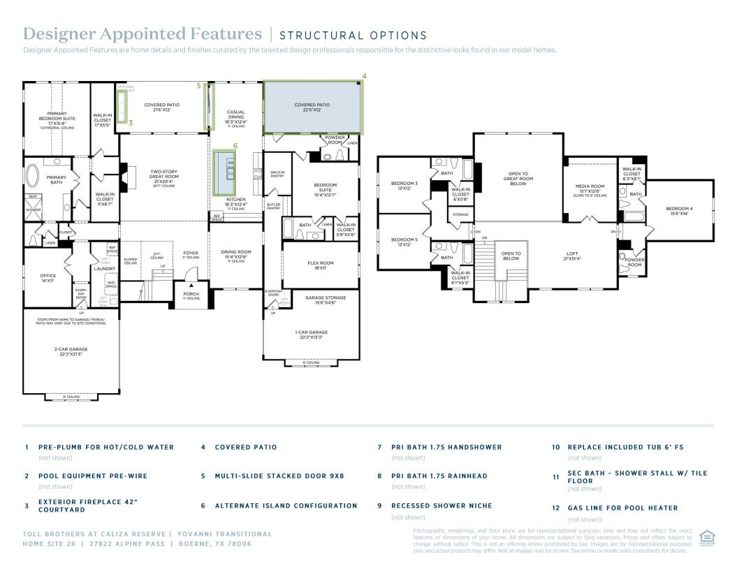 The Yovanni offers an impressive blend of luxury and style within its expansive two-story floor plan. The heart of the home is a stunning two-story great room that is central to a formal dining room and an expansive covered patio. Overlooking a casual dining area, the gourmet kitchen is a chef's dream, offering a center island, a large walk-in pantry, and a butler pantry that conveniently connects to the formal dining room. The spacious primary bedroom suite is secluded off the main living space, highlighted by an elegant cathedral ceiling, dual walk-in closets, and a spa-inspired private bath complete with separate vanities, a luxurious shower, a freestanding tub, and a private water closet. A versatile loft is the focal point of the second floor, central to a media room and three secondary bedrooms, each with a walk-in closet and private bath. An additional bedroom suite can be found off the kitchen, offering a walk-in closet and private bath as well. Also featured in the Yovanni is a large flex room, a private office, powder rooms on the first and second floor, easily accessible laundry, and an everyday entry.