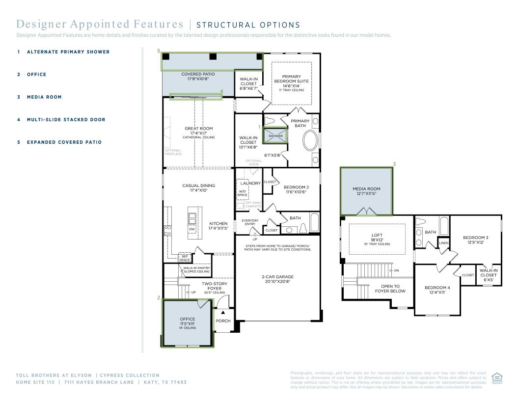 The beautifully designed Tamara showcases an idyllic blend of luxury and charm. An airy two-story foyer flows into the expansive great room with a lovely vaulted ceiling and pristine views of the large covered patio beyond. The kitchen is a chef's dream, offering a spacious casual dining area, large center island with breakfast bar, wraparound counter and cabinet space, as well as a walk-in pantry. Secluded off the great room, the elegant primary bedroom suite is complemented by a tray ceiling, dual walk-in closets, and a luxurious primary bath complete with dual vanities, large soaking tub, luxe shower, and a private water closet. Central to a generous loft with tray ceiling, secondary bedrooms feature walk-in closets and share a hall bath with a dual-sink vanity. An additional first-floor bedroom with closet and shared hall bath can be found off the foyer, with other features of the Tamara including a sizable flex room, easily-accessible laundry, convenient everyday entry, and additional storage throughout.