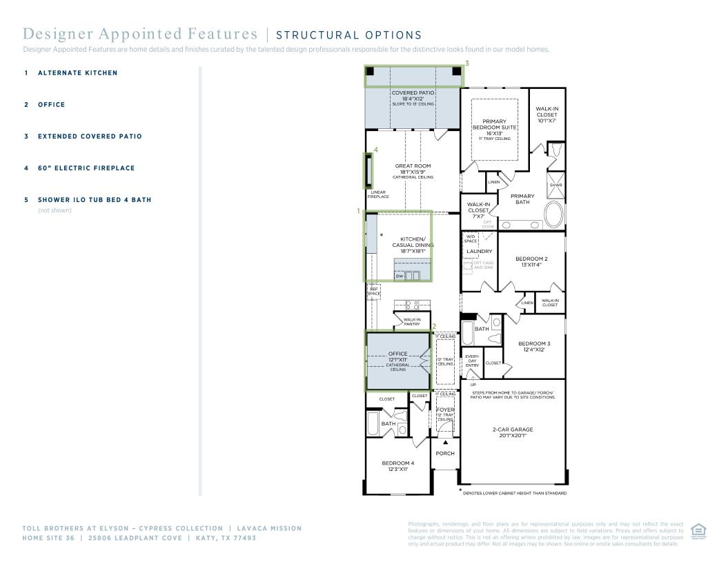 The Lavaca's welcoming porch and inviting foyer hallway with tray ceilings open onto the elegant formal dining room, offering views to the expansive great room and desirable covered patio. The well-appointed kitchen overlooks a bright casual dining area, and is complete with a large center island with breakfast bar, plenty of counter and cabinet space, and enormous walk-in pantry. The impressive primary bedroom suite is enhanced by a gorgeous cathedral ceiling, dual walk-in closets, and deluxe primary bath with dual-sink vanity, large soaking tub, luxe shower with seat, and private water closet. Secondary bedrooms feature sizable closets, one with private bath, two with shared hall bath. Additional highlights include a convenient everyday entry, centrally located laundry, and additional storage.