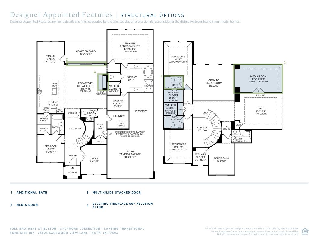 The Lansing leaves an impression at every turn, from its expansive two-story foyer with elegant circular staircase to its grand two-story great room with desirable covered patio beyond. A secluded home office and private bedroom suite are set at the front of the home. Beyond the entry the home opens to the great room and well-designed kitchen overlooking a bright casual dining area, and large center island with breakfast bar and plenty of counter and cabinet space, and sizable walk-in pantry. The primary bedroom suite is enhanced by a gorgeous tray ceiling, dual walk-in closets, and marvelous primary bath with dual vanities, large soaking tub, luxe shower, and private water closet. Upstairs, a spacious loft connects to three additional secondary bedrooms, one with private bath and two with shared hall bath with dual-sink vanity, and each featuring walk-in closets. Additional highlights include a convenient powder room and everyday entry; centrally located laundry; and additional storage