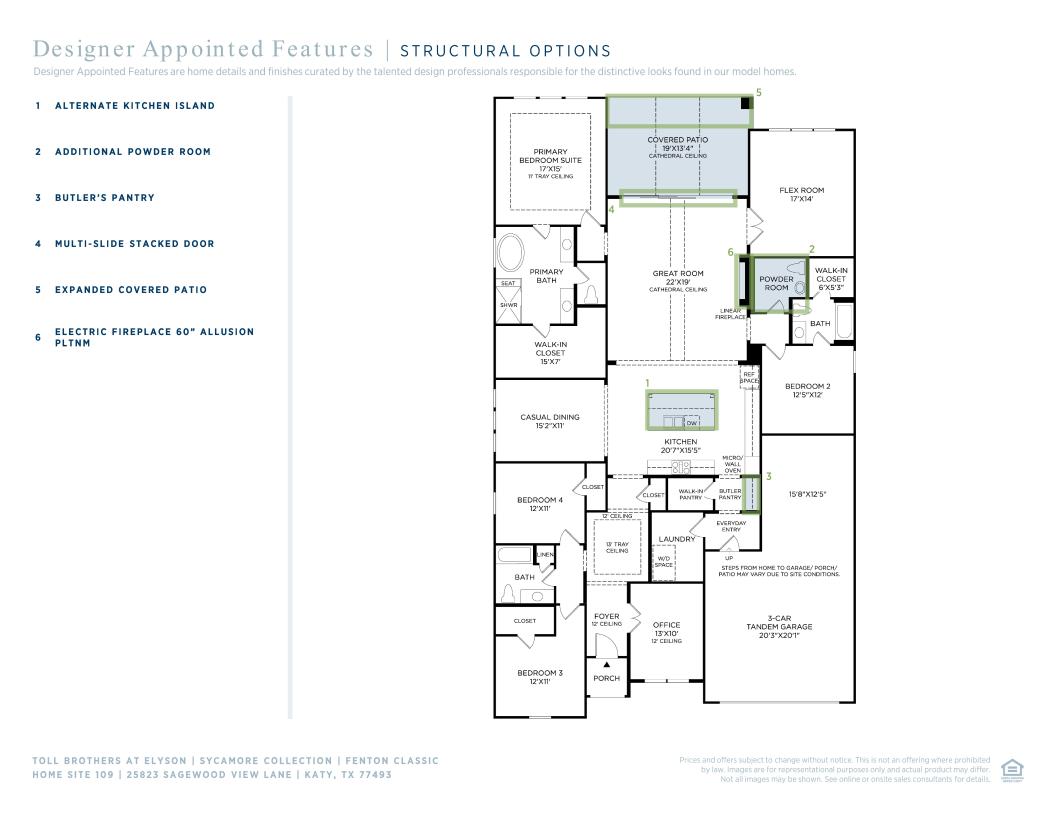 The kitchen is truly the heart of the Fenton home design. The well-designed kitchen overlooks a sizable casual dining area perfect for entertaining, and features a large center island with breakfast bar, ample counter and cabinet space, and a roomy walk-in pantry. Beyond the kitchen lies the impressive great room with cathedral ceiling and views to the spacious covered patio. Adjacent to the great room is a spacious flex room with additional storage. The primary bedroom suite is enhanced by a lovely tray ceiling, king-size walk-in closet, and deluxe primary bath with dual vanities, large soaking tub, luxe shower with seat, and private water closet. Secondary bedrooms, one with private bath and two with shared hall bath, each feature large closets. Additional highlights include a versatile office off the foyer, convenient everyday entry, centrally located laundry, and additional storage.