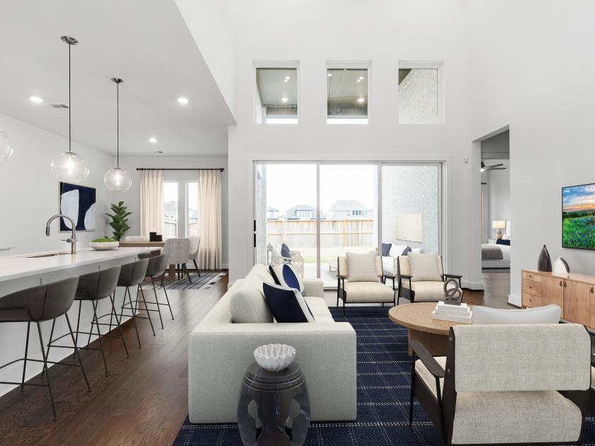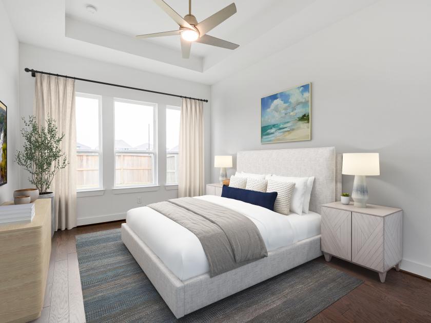 The soaring two-story foyer of the Bautista makes an immediate impression as it extends into the expansive two-story great room with access to the rear covered patio and views of a intimate casual dining area. A large center island with breakfast bar defines the well-appointed kitchen, offering plenty of counter and cabinet space as well as an ample walk-in pantry. The charming primary bedroom suite is highlighted by a gorgeous tray ceiling, generous walk-in closet, and a beautiful primary bath complete with dual vanities, large soaking tub, deluxe shower, and a private water closet. The secondary bedroom is conveniently located off the foyer, featuring a walk-in closet and a shared hall bath. Secluded on the second floor, an additional bedroom with a walk-in closet and shared hall bath overlooks a spacious loft with tray ceiling. Additional highlights include a large flex room on the first floor, centrally located laundry, convenient everyday entry, and ample additional storage.