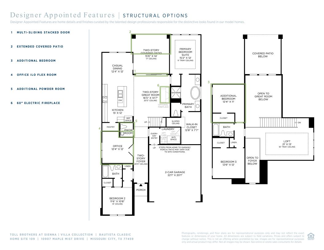 The soaring two-story foyer of the Bautista makes an immediate impression as it extends into the expansive two-story great room with access to the rear covered patio and views of a intimate casual dining area. A large center island with breakfast bar defines the well-appointed kitchen, offering plenty of counter and cabinet space as well as an ample walk-in pantry. The charming primary bedroom suite is highlighted by a gorgeous tray ceiling, generous walk-in closet, and a beautiful primary bath complete with dual vanities, large soaking tub, deluxe shower, and a private water closet. The secondary bedroom is conveniently located off the foyer, featuring a walk-in closet and a shared hall bath. Secluded on the second floor, an additional bedroom with a walk-in closet and shared hall bath overlooks a spacious loft with tray ceiling. Additional highlights include a large flex room on the first floor, centrally located laundry, convenient everyday entry, and ample additional storage.