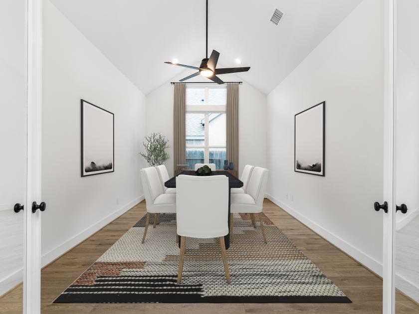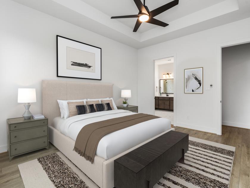 The Amneris wonderfully blends charm with sophistication starting with its extended foyer with tray ceilings opening onto the beautiful open-concept great room and casual dining area, with desirable access to a large covered patio beyond. Adjacent to a versatile flex room with vaulted ceiling, the kitchen is a chef's dream that features a stately central island with breakfast bar, plenty of counter and cabinet space, and a walk-in pantry. The elegant primary bedroom suite is hidden off the great room and complimented by a lovely tray ceiling, dual walk-in closets, and a deluxe primary bath that includes a dual-sink vanity, large soaking tub, luxe shower with seat, and a private water closet. Conveniently located off the foyer, sizable secondary bedrooms are feature roomy closets and a shared hall bath. The Amneris also features a convenient powder room and everyday entry, centrally located laundry, and plenty of additional storage.