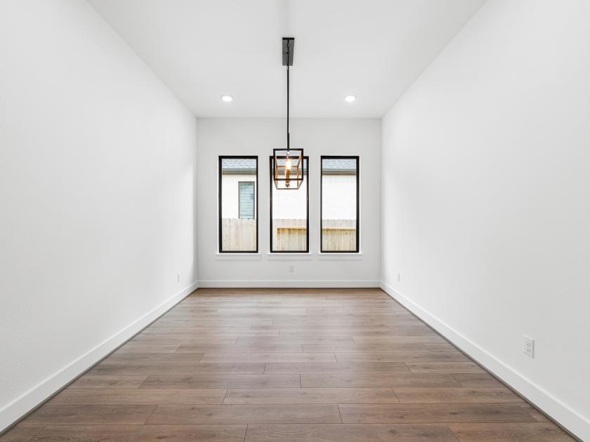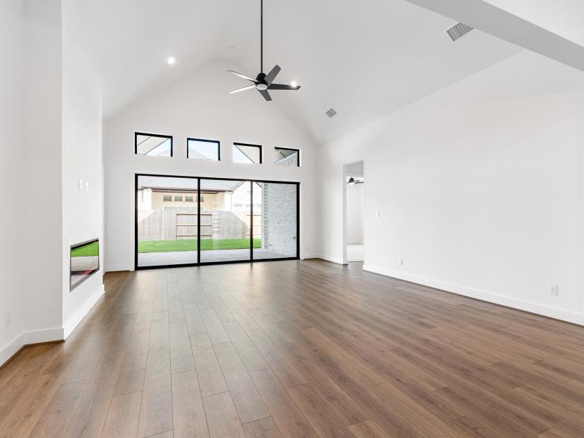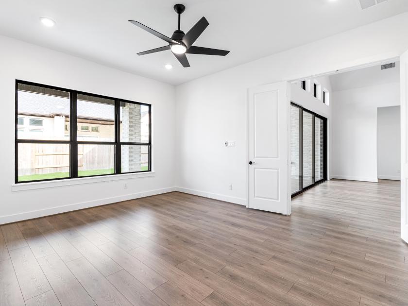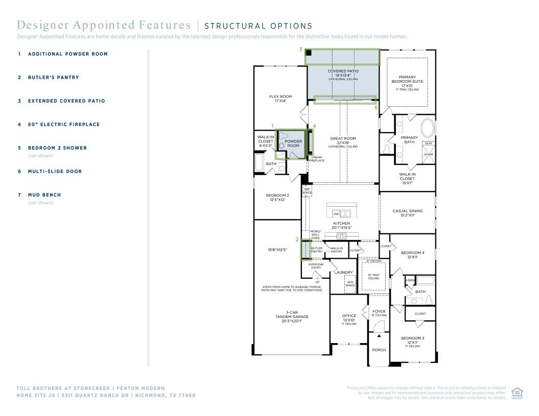 The kitchen is truly the heart of the Fenton home design. The well-designed kitchen overlooks a sizable casual dining area perfect for entertaining, and features a large center island with breakfast bar, ample counter and cabinet space, and a roomy walk-in pantry. Beyond the kitchen lies the impressive great room with cathedral ceiling and views to the spacious covered patio. Adjacent to the great room is a spacious flex room with additional storage. The primary bedroom suite is enhanced by a lovely tray ceiling, king-size walk-in closet, and deluxe primary bath with dual vanities, large soaking tub, luxe shower with seat, and private water closet. Secondary bedrooms, one with private bath and two with shared hall bath, each feature large closets. Additional highlights include a versatile office off the foyer, convenient everyday entry, centrally located laundry, and additional storage.