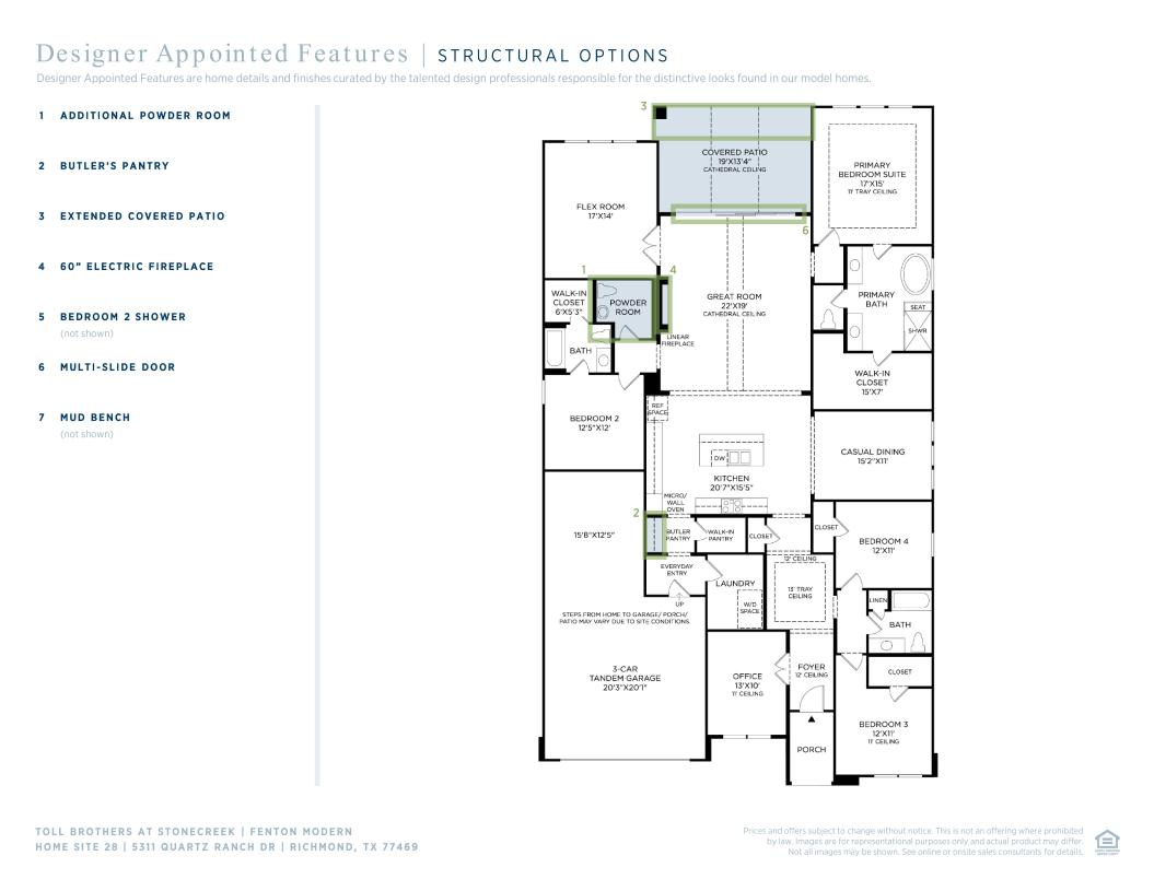 The kitchen is truly the heart of the Fenton home design. The well-designed kitchen overlooks a sizable casual dining area perfect for entertaining, and features a large center island with breakfast bar, ample counter and cabinet space, and a roomy walk-in pantry. Beyond the kitchen lies the impressive great room with cathedral ceiling and views to the spacious covered patio. Adjacent to the great room is a spacious flex room with additional storage. The primary bedroom suite is enhanced by a lovely tray ceiling, king-size walk-in closet, and deluxe primary bath with dual vanities, large soaking tub, luxe shower with seat, and private water closet. Secondary bedrooms, one with private bath and two with shared hall bath, each feature large closets. Additional highlights include a versatile office off the foyer, convenient everyday entry, centrally located laundry, and additional storage.