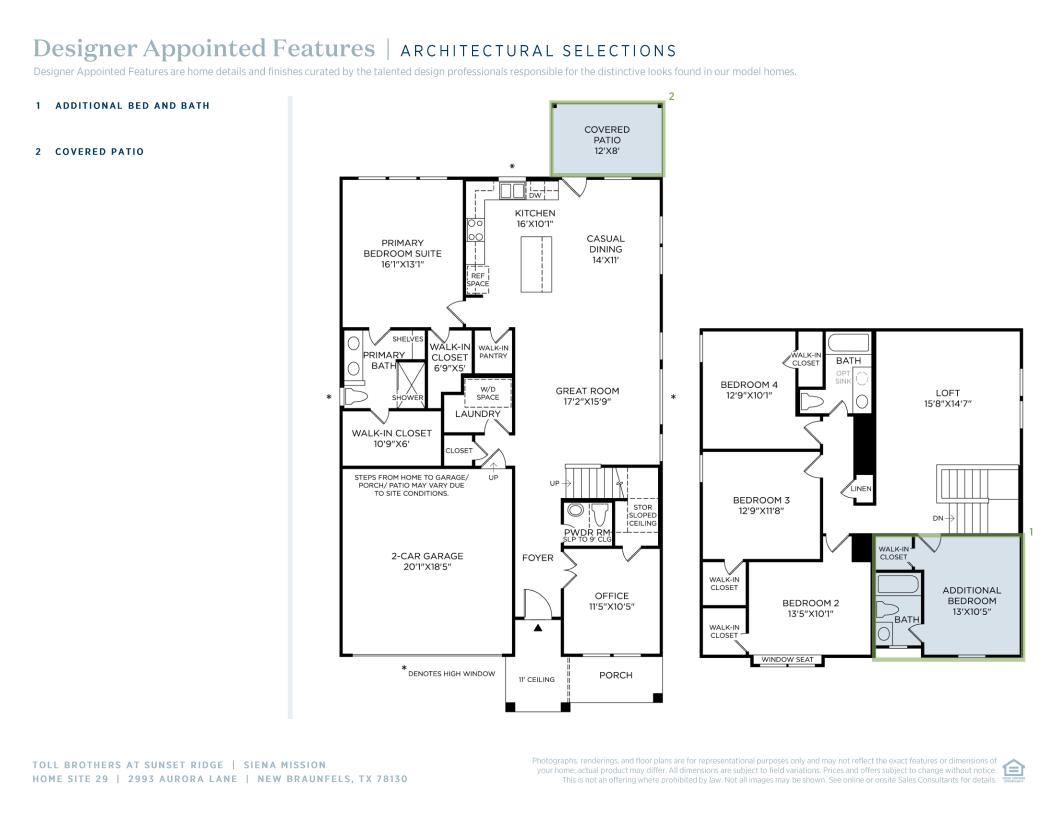 The beautifully crafted Siena showcases a collection of exquisite living spaces that offer modern architecture in an open-concept floor plan. The stunning great room overlooks a spacious casual dining area and rear patio, as the kitchen features an oversized center island with breakfast bar, wraparound counter and cabinet space, as well as a sizable walk-in pantry. Complementing the elegant primary bedroom suite are dual walk-in closets and a spa-like primary bath with a dual-sink vanity, a luxe shower with seat, linen storage, and a private water closet. Central to a generous loft on the second floor, the secondary bedrooms feature walk-in closets and share a hall bath. Additionally offered in the Siena are a secluded office off the main entry, a convenient powder room, easily accessible laundry, and additional storage throughout.