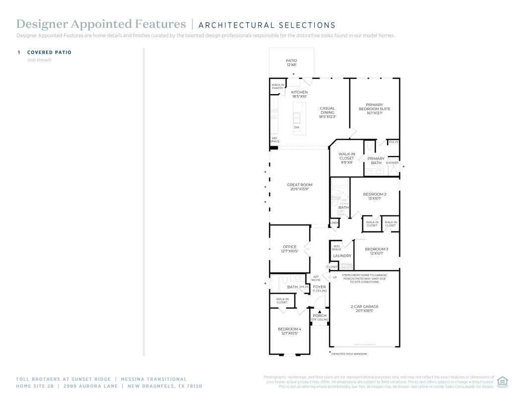 The Messina leaves a lasting impression with luxurious living spaces and distinct architecture. The front entry flows past a spacious office welcoming you into the expansive great room, presenting views of a casual dining area and a large rear patio. The kitchen is impressively equipped with a large center island with a breakfast bar, plenty of counter and cabinet space, and a roomy walk-in pantry. Highlighting the marvelous primary bedroom suite are a generous walk-in closet and an elegant primary bath complete with a dual-sink vanity, a large luxe shower, linen storage, and a private water closet. Offering walk-in closets, the secondary bedrooms are sizable and share two hall baths, one with a separate vanity area. Easily accessible laundry and ample additional storage are also featured in the Messina.
